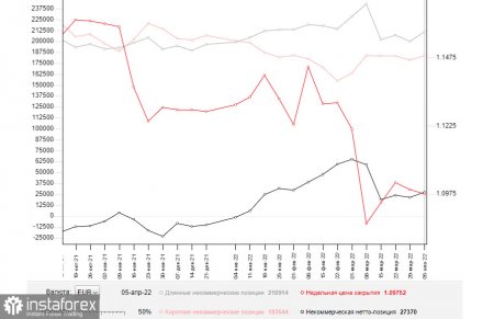 Прежде чем говорить о дальнейших перспективах движения EUR/USD давайте посмотрим, что происходило на фьючерсном рынке и как изменились позиции Commitment of Traders. В COT отчете (Commitment of Traders) за 5 апреля зафиксирован рост как коротких, так и длинных позиций и что примечательно, покупателей оказалось больше, чем продавцов. Все это характеризуется позитивными ожиданиями новых мер со стороны Европейского центрального банка, который в последнее время много говорит о необходимости проведения более жесткой денежно-кредитной политики. Однако отсутствие положительной динамики переговоров России и Украины, и рост геополитической напряженности продолжают негативно отражаться на евро, что не позволяет быкам выстроить даже нормальную восходящую коррекцию. В ближайшее время нас ожидают важные данные по инфляции в странах еврозоны и США. Отчеты будут содержать в себе уже более объективные цифры о темпах роста цен после начала военной спецоперации России. Это даст инвесторам и политикам больше ориентиров в том, как следует дальше поступать с денежно-кредитной политикой, что позволит частично определиться с дальнейшим направлением пары EUR/USD. В COT отчете указано, что длинные некоммерческие позиции выросли с уровня 200 043 до уровня 210 914, в то время как короткие некоммерческие позиции выросли с уровня 178 669 до уровня 183 544. Учитывая, что рост коротких позиций оказалось менее внушительным чем длинных, по итогам недели общая некоммерческая нетто-позиция выросла и составила 27 370 против 21 374. Недельная цена закрытия опустилась до 1.0976 с 1.0991.