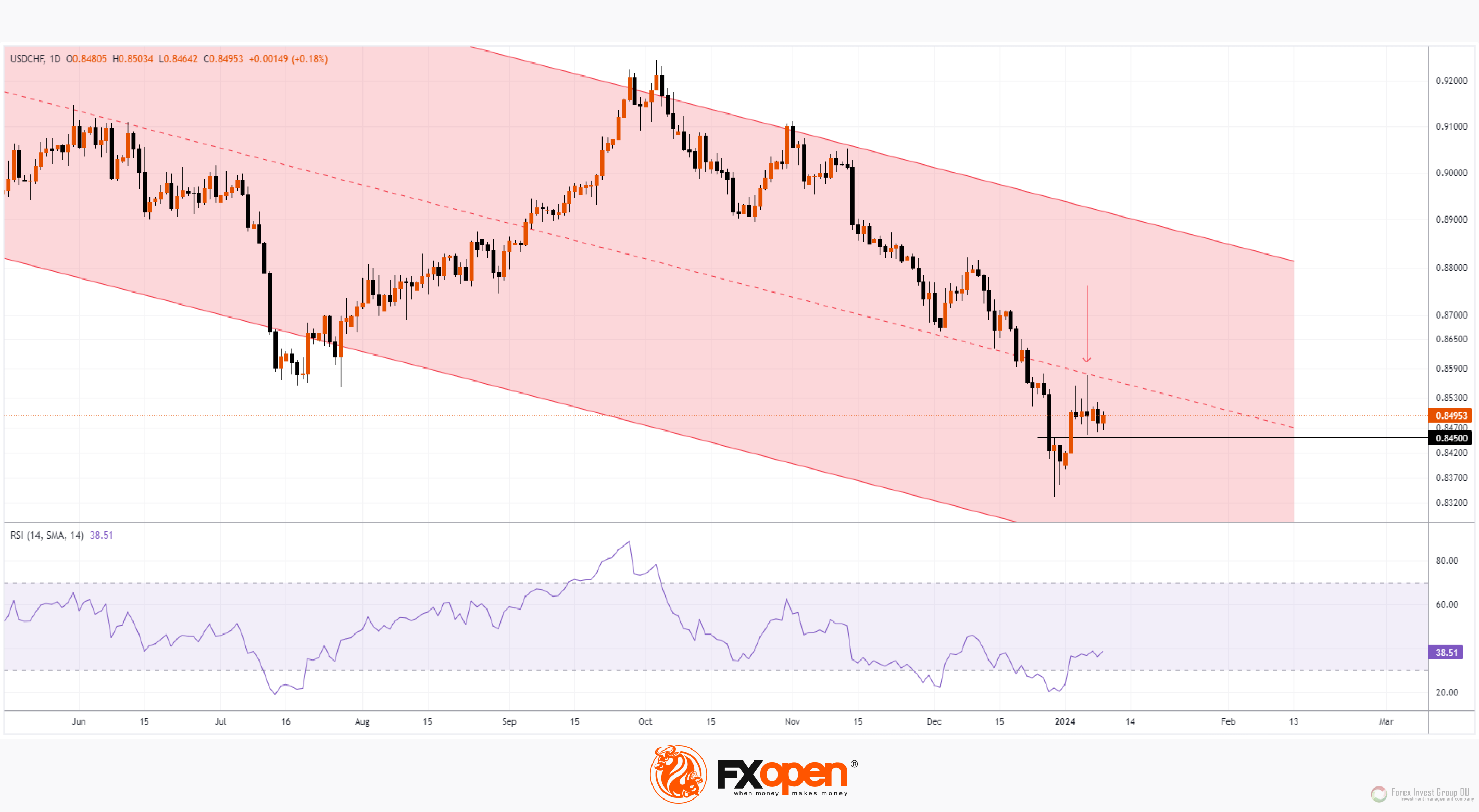 2 ноября мы писали, что франк может продолжить укрепление. С тех пор курс USD/CHF снизился приблизительно на 6%, установив минимум 2023 года 28 декабря на уровне 0,83327.