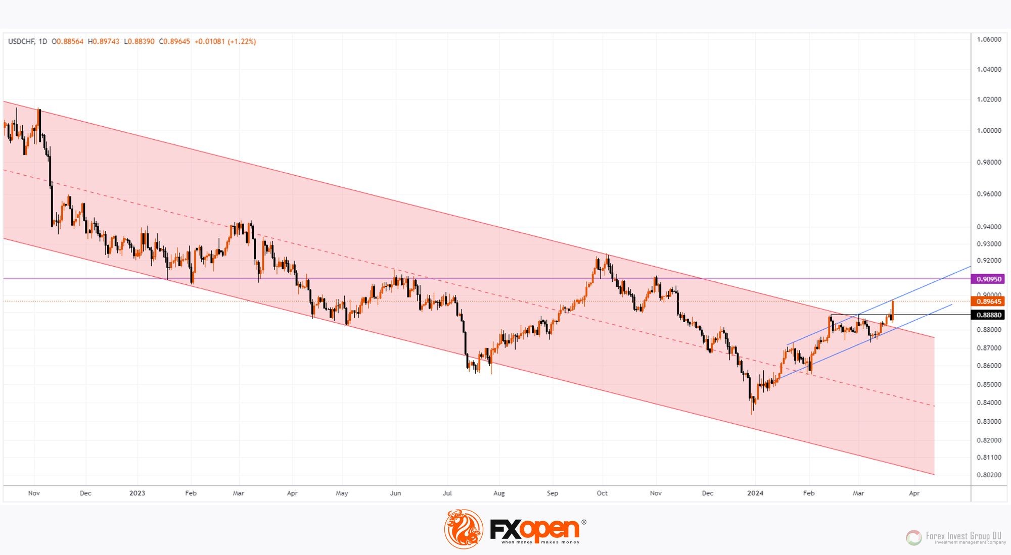 Технический анализ графика USD/CHF сегодня показывает, что быки ломают нисходящий тренд (показан красным каналом), который берет начало еще осенью 2022 года. При этом: