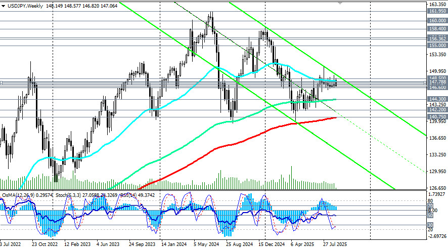 Техническая картина На момент публикации данной статьи, пара USD/JPY торговалась вблизи отметки 147.05, пытаясь оттолкнуться от сегодняшнего и 3-дневного минимума 146.82, достигнутого в начале европейской торговой сессии. Тем не менее, негативная динамика пары преобладает ниже ключевого среднесрочного уровня сопротивления 147.85 (200-периодная скользящая средняя на дневном графике). Решительный пробой зоны поддержки 146.80 – 146.60 может спровоцировать дальнейшее снижение в сторону ближайшего значимого уровня поддержки 144.30 (подробнее о динамике пары см. в [i]USD/JPY: торговые сценарии на 09.09.2025). Вывод Преобладает нисходящая динамика цены. Однако, необходимо учитывать предстоящие публикации американских индексов инфляции. Инвесторы хорошо помнят, как после публикации предыдущего отчёта по индексу PPI, который оказался значительно выше ожиданий (годовой индекс вырос до 3,3% против прогноза 2,5%, тогда как в июне показатель составлял 2,4%. Месячный рост PPI и базового PPI (без учета цен на энергоносители и продукты питания) составил 0,9%. Годовой базовый PPI также подскочил до 3,7% против 2,6% месяцем ранее), заставил изменить их отношение к доллару, который значительно укрепился после публикации PPI. Инвесторы интерпретировали усиление инфляции как фактор, потенциально поддерживающий более жесткую монетарную политику. Ситуация может повториться на этой неделе, если американские индексы CPI и PPI вновь окажутся сильнее прогнозов и предыдущих значений. Хотя, рынок труда показывает признаки замедления, рост инфляции производителей становится всё более заметным. Это может повлиять на будущие решения Федеральной резервной системы и поддержать доллар в краткосрочной перспективе. С технической точки зрения, ближайшим сопротивлением выступает максимум сегодняшней азиатской сессии около 147.50. Устойчивый рост выше этой отметки может привести к возвращению к 148.00 – 148.50. Пробой 149.00 может изменить краткосрочный тренд в пользу быков, с потенциалом роста к 150.00 – 151.00. В то же время, спекуляции о возможных повышениях ставки со стороны Банка Японии к концу года, вероятно, сохранятся, что будет продавливать пару USD/JPY в сторону зоны ключевых поддержек на уровнях 144.30, 140.75 (144- и 200-периодные скользящие средние на недельном графике пары), особенно, учитывая возросшие ожидания относительно действий руководства ФРС по снижению процентной ставки.Материал предоставлен компанией InstaForex - www.instaforex.com