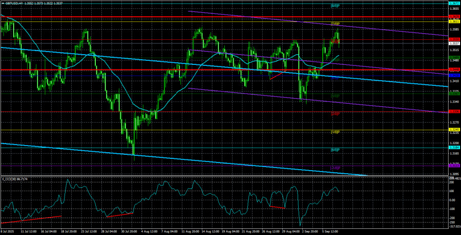 Валютная пара GBP/USD на торгах во вторник продолжала торговаться достаточно спокойно, но с восходящим уклоном. Уже через неделю состоится заседание пресловутое заседание ФРС, которого рынок ждет не меньше, чем отчеты по Нонфармам или безработице. В принципе, интриги уже нет никакой, так как последние отчеты по рынку труда и безработице показали отсутствие каких-либо улучшений. Поэтому с вероятностью 99,9% ФедРезерв примет решение понизить ключевую ставку на 0,25%. Почему не больше? Ответ на этот вопрос прост, но требуется пояснений. Если коротко, то потому, что Джером Пауэлл остается председателем, а состав Комитета FOMC остается независимым. Дональд Трамп делает все возможное, чтобы Пауэлл и все его коллеги, которые не хотят голосовать за снижение ставки, покинули свои должности как можно скорее, но все же даже президент США не может решить эту «проблему» за пару недель. Таким образом, в любом случае Трампу придется подождать. А пока он будет ждать, Пауэлл и компания будут идти по строго намеченному еще в начале года плану. Напомним, что с января месяца все графики «dot-plot» свидетельствуют о двух снижениях ставки в текущем году. ФРС пока еще сохраняет свою независимость от Трампа, поэтому не будет полностью закрывать глаза на инфляцию. Следовательно, никто не собирается понижать ставку, сломя голову. Два этапа смягчения до конца 2025 года выглядят базовым сценарием. Ситуация с макроэкономическими данными поменялась за лето и сейчас инфляция уже не является приоритетной целью ФРС. Если выразиться более точно, ФРС просто не сумеет добиться максимальной занятости и низкой инфляции одновременно. Однако мандаты ФРС следует понимать правильно. ФРС обязана СТРЕМИТЬСЯ к максимальной занятости и ценовой стабильности. И именно это американский регулятор и продолжит делать. Чтобы удержать контроль над инфляцией, ставку нельзя снижать слишком сильно и слишком часто. Чтобы стимулировать рынок труда, нужно понизить ставку. Таким образом, ФедРезерв с вероятностью 99% выберет промежуточный вариант, при котором и рынок труда перестанет «лежать в нокдауне», но и инфляцию в свободное плавание отпущена не будет. А два раунда смягчения монетарной политики рынок имел возможность отработать еще с начала года. Поэтому, возможно, доллар и не ждет новый обвал по всему рынку на основании этого фактора. Однако если еще раз оценить весь фундаментальный фон, то становится понятно – доллар и дальше будет только падать. Вероятно, уже не так стремительно, как в первой половине 2025 года, но все равно будет. На дневном ТФ техническая картина выглядит достаточно однозначно. Мы увидели небольшую коррекцию, а сейчас, следовательно, начался новый виток восходящего тренда. Таким образом, мы не сомневаемся, что к концу года фунт стерлингов сумеет достичь уровень 1,40$, чего с ним не случалось с 2021 года. Средняя волатильность пары GBP/USD за последние 5 торговых дней составляет 90 пунктов. Для пары фунт/доллар это значение является «средним». В среду, 10 сентября, таким образом, мы ожидаем движения внутри диапазона, ограниченного уровнями 1,3448 и 1,3628. Старший канал линейной регрессии направлен вверх, что указывает на однозначную восходящую тенденцию. Индикатор CCI вновь заходил в область перепроданности, что еще раз предупредило о возобновлении восходящего тренда. Ближайшие уровни под