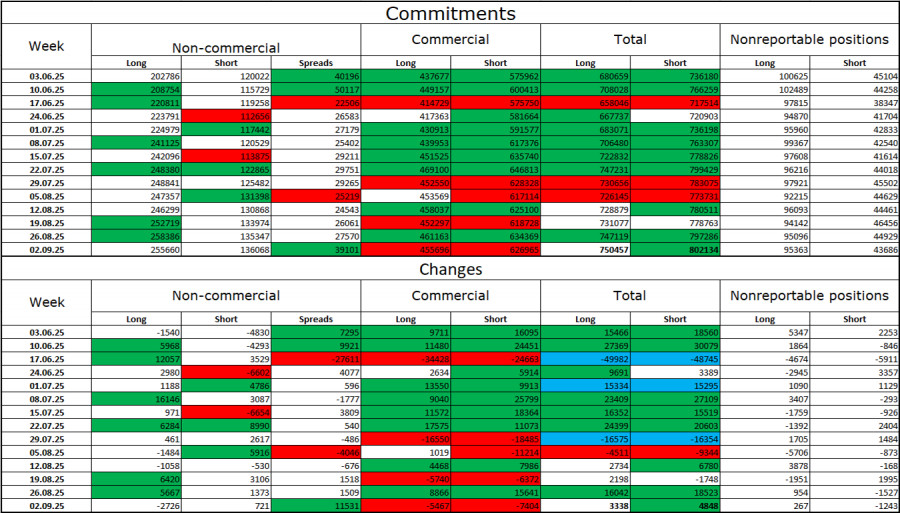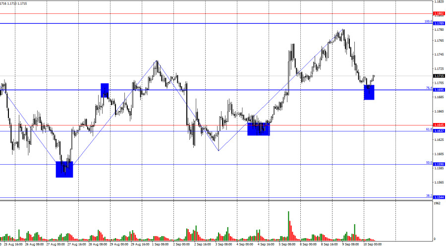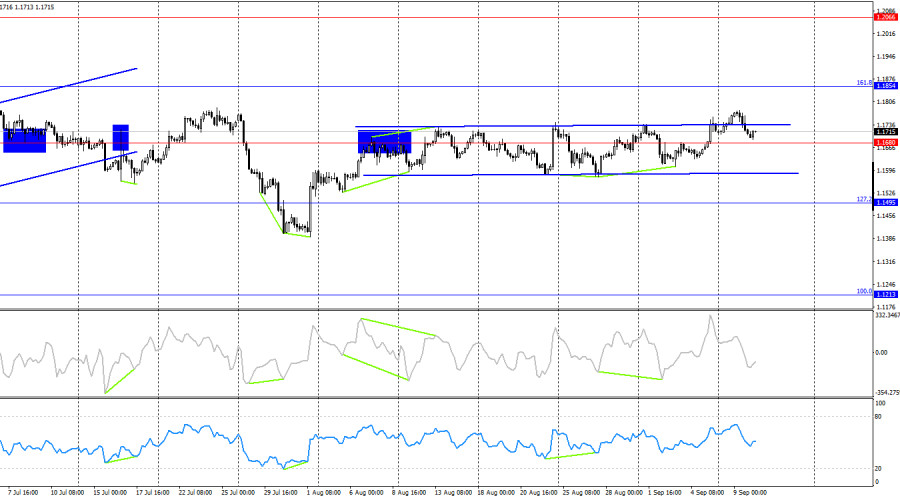 Ситуация с волнами на часовом графике остается простой и понятной. Последняя завершенная волна вверх пробила пик предыдущей волны, а последняя волна вниз не пробила предыдущий лоу. Таким образом, в данное время тренд является «бычий», хоть и не очень сильным и уверенным. Последние данные по рынку труда и изменившиеся перспективы ДКП ФРС поддерживают только трейдеров-быков. Во вторник экономических данных в мире было немного. Годовой отчет Nonfarm Payrolls не придал оптимизма любителям американской валюты, однако медведи в течение дня все равно провели противоречивую атаку. Я не считаю, что рост доллара на очередном провале рынка труда США был закономерным. Однако у рынка может быть своя точка зрения. Уже сегодня в Америке выйдет индекс цен производителей, а завтра – индекс потребительских цен. Я не могу сказать, что от этих двух отчетов зависит судьба решения ФРС по ДКП на следующей неделе, потому что это не так. На первом месте для ФРС сейчас стоит рынок труда, который страдает уже 4 месяца. Поэтому инфляция временно отходит на второй план. Она может лишь усугубить положение доллара, если по итогам августа индексы PPI и CPI окажутся слабее ожиданий трейдеров. Низкая инфляция покажет, что позиция Дональда Трампа и Скотта Бессента верна, и они не зря требуют смягчения ДКП от FOMC. На мой взгляд, инфляция в Америке будет и дальше только расти, но теперь важны темпы ее роста. Если они будут слабыми или отсутствовать, у ФРС появляется больше оснований для более агрессивного смягчения политики.