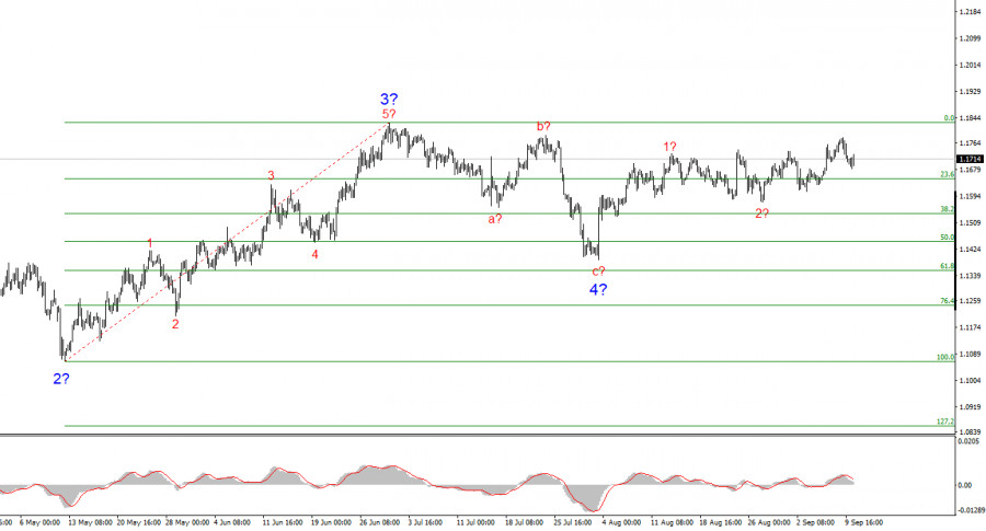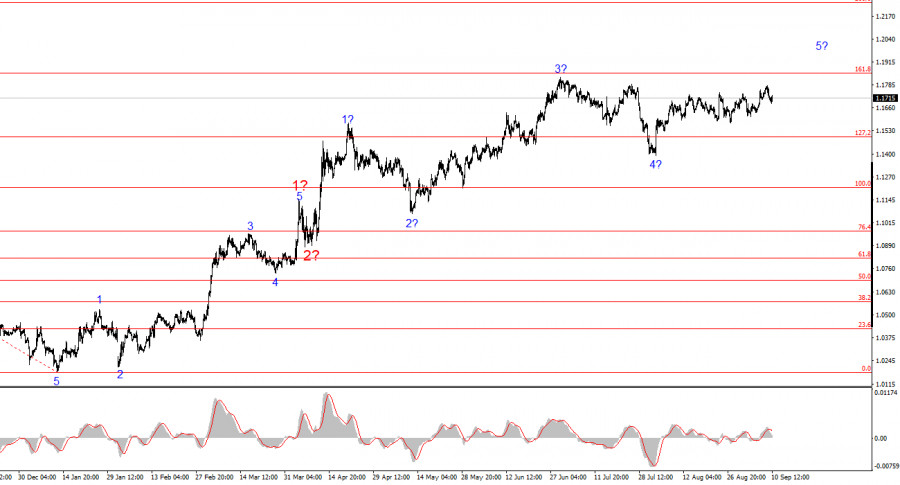 Курс инструмента EUR/USD в течение среды практически не изменился, а во вторник потерял целых 50 пунктов. Я удивлен таким снижением инструмента EUR/USD, хотя, по большому счету, оно ни на что не влияет и ничего не значит. Построение повышательного участка тренда, берущего свое начало в январе 2025 года, продолжается. Построение предполагаемой волны 5 этого участка тренда продолжается. Волновая разметка не вызывает никаких вопросов и сомнений. Медлительность рынка немного удручает, но спрос на валюту США так или иначе все равно снижается, что и требуется. На прошлой неделе в США вышли отчеты по деловой активности, безработице и рынку труда. Завтра выйдет индекс потребительских цен. Напомню своим читателям, что для ФРС сейчас имеют значение три показателя, от которых Комитет FOMC будет отталкиваться при принятии решения по денежно-кредитной политике. Это – инфляция, безработица и рынок труда. Три столпа экономики. Рынок труда и безработица показали значения, которые не хочется видеть, и которые повышают и без того стопроцентную вероятность снижения процентной ставки в сентябре. А завтра выйдет отчет по инфляции, которые может хотя бы немного смягчить «голубиные» ожидания, которые не сулят американской валюте ничего хорошего. Но для этого нужно, чтобы инфляция в США в августе выросла не сильнее прогнозов, не выросла или же вовсе снизилась. Стоит ли рассчитывать на такой сценарий? Сегодня вышел индекс цен производителей в США, который является составной частью общего показателя инфляции. В августе цены производителей снизились на 0,1% против прогноза +0,3%. Это не обязательно означает, что основная инфляция тоже замедлится. В прошлом месяце цены производителей подскочили почти на 1%, который еще не нашел своего отражения в показателе инфляции. Поэтому я склонен считать, что индекс потребительских цен вырастет в августе минимум до 2,9% в годовом исчислении.Общие выводы