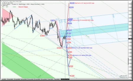 Операционный масштаб Minute (таймфрейм h4)USD/CHF - h4 - обзор вариантов развития движения данного валютного инструмента с 11 сентября 2025 г.Предыдущий обзор US Dollar vs Swiss Franc (таймфрейм Daily) от 05.09.2025 г. 17:14___________________US Dollar vs Swiss FrancДвижение USD/CHF-h4 с 11 сентября 2025 года будет обусловлено границами канала 1/2 Median Line Minuette-h1 (0.7945 - 0.7965 - 0.7979) и зоны равновесия (0.7979 - 0.7997 - 0.8015) вил младшего операционного масштаба minuette-h1 - разметка отработки данных уровней показаны на графике ниже.Нисходящее движение.В случае пробоя нижней границы канала 1/2 Median Line (уровень поддержки 0.7945) вил младшего операционного масштаба Minuette-h1 движение данной валютной пары может иметь продолжение к целям:- minimum 0.7914 от 09 сентября 2025 года;