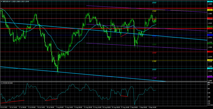 Валютная пара GBP/USD на торгах в среду вновь двигалась достаточно спокойно, что, в принципе, и не удивительно, так как за весь день был опубликован только один отчет – индекс цен производителей в США. Несмотря на то, что месяцем ранее этот же отчет спровоцировал довольно сильное движение на рынке, мы сразу предупреждали, что все будет зависеть от соотношения фактическое значение/прогноз. Однако, хоть в последние недели обе основные валютные пары не балуют трейдеров трендовым движением, это не означает, что новостей нет никаких. Большая их часть, конечно же, связана с личностью Дональда Трампа. К примеру, Трамп по-прежнему старается «потушить» конфликт между Украиной и Россией, но по-прежнему не знает ни одного метода, кроме тарифов и санкций, для достижения собственной цели. Напомним, что Трамп очень заинтересован в завершении войны между Киевом и Москвой, так как хочет получить Нобелевскую премию мира в октябре 2025 года. Просто вдумайтесь, президент США принимает глобальные геополитические решения для того, чтобы получить личную награду. Такова реальность 2025 года. Может быть просто вручить Трампу награду «Владыка мира» и «Царь всея земли»? Ради мира в Украине Нобелевской премии Трамп готов на все. Он готов вести диалог с Владимиром Путиным, Владимиром Зеленским, а параллельно вводить тарифы против Индии, чтобы та не покупала нефть и газ в России, и подначивать Евросоюз отказаться от закупок в РФ, одновременно требуя ввести санкции против Индии и Китая. При чем, сам Трамп не хочет открыто выступать против РФ. Президент США понимает, что усугубление отношений с Москвой еще сильнее укрепит ее связи с Китаем и Индией. А все вместе три эти страны занимают львиную часть Евразии. С таким противником совладать будет тяжело даже Америке, поэтому Трамп любыми путями хочет не допустить этого. Штаты при Трампе вновь готовы стать другом для России, вести совместный бизнес, развиваться плечом о плечо. И все в мире понимают, что основной целью Трампа является не дружба с Россией, а недопущение дружбы России с Индией и Китаем. В общем, ситуация абсурдная и парадоксальная, но она именно такая. Отдельно хочется вспомнить о таком персонаже, как Лиза Кук. Госпожу Кук Трамп уволил с ее должности члена Монетарного комитета ФРС несколько недель назад. Кук обратилась в Верховный суд США в Вашингтоне, и суд постановил восстановить госпожу Кук на ее должности. Иными словами, Суд открыто пояснил Трампу, что у него в коллекции пока нет награды «Вершитель судеб», поэтому нужно придерживаться законодательства США. Хотя бы иногда. Также напомним, что уже два суда в США признали, что практически все пошлины Трампа являются незаконными. Дело остается за малым. Если тот же Верховный суд, куда у Трампа, должно быть, уже имеется абонемент на ежедневные посещения, постановит пошлины президента США превышением его полномочий, то они будут официально отменены. Но как потом разматывать «клубок» пошлин и торговых соглашений, уже подписанных на основании пошлин, абсолютно непонятно. Одно ясно – скучать в следующие три года не придется. Средняя волатильность пары GBP/USD за последние 5 торговых дней составляет 74 пункта. Для пары фунт/доллар это значение является «средним». В четверг, 11 сентября, таким образом, мы ожидаем движения внутри диапазона, ограниченного уровнями 1,3476 и 1
