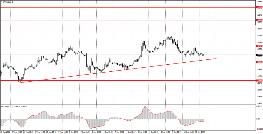 На часовом таймфрейме пара EUR/USD имеет все шансы возобновить восходящий тренд, который формируется с начала текущего года, а флэт можно считать завершенным. Фундаментальный и макроэкономический фон остается для доллара США провальным, поэтому укрепления американской валюты мы по-прежнему не ждем. С нашей точки зрения, как и раньше, американская валюта может рассчитывать только на технические коррекции. Однако закрепление ниже линии тренда может спровоцировать новый виток технического падения пары. В четверг пара EUR/USD может возобновить восходящее движение, так как тенденция остается восходящей. Однако нужны новые торговые сигналы в областях 1,1655-1,1666 и 1,1737-1,1745. На 5-минутном ТФ следует рассматривать уровни 1,1198-1,1218, 1,1267-1,1292, 1,1354-1,1363, 1,1413, 1,1455-1,1474, 1,1527, 1,1571-1,1584, 1,1655-1,1666, 1,1737-1,1745, 1,1808, 1,1851, 1,1908. В четверг в Евросоюзе состоится заседание ЕЦБ, а в США – публикация отчета по инфляции. Оба события являются важными, но лишь формально. От ЕЦБ сейчас никто не ждет ни снижения ставки, ни обещаний понизить ставку в будущем. Инфляция в США не имеет никакого влияния на решение ФРС 17 сентября. Однако спровоцировать реакцию эти события все же могут.Основные правила торговой системы: