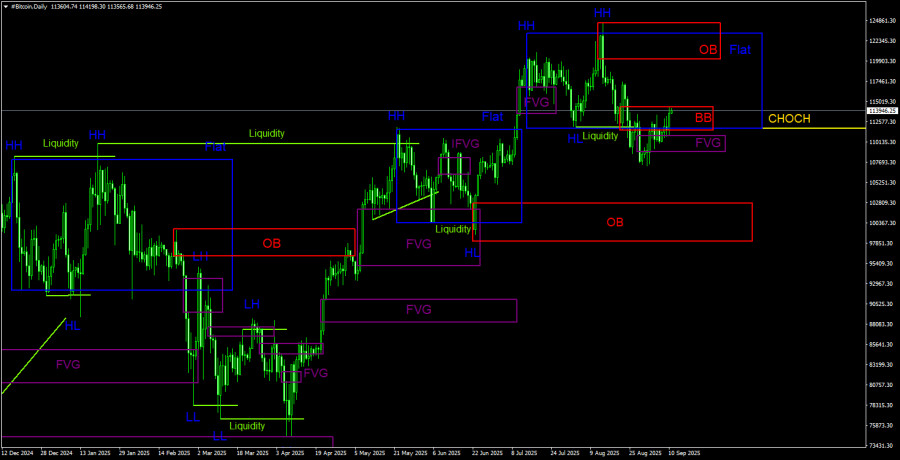 Биткоин всерьез нацелился на падение, но это намерение остается лишь намерением. Была сформирована целая куча сигналов и паттернов на продажу, произошел слом восходящей структуры, но при этом падать первая криптовалюта вновь не спешит. Возможно, рынок ожидает какого-либо триггера, однако в ближайшее время потенциальных триггеров будет немного. Сегодня выйдет отчет по американской инфляции, на следующей неделе – состоится заседание ФРС. Американский регулятор наверняка примет решение о снижении ключевой ставки, впервые в 2025 году, однако, на наш взгляд, как минимум, два смягчения монетарной политики, запланированные на 2025 году, уже давно отработаны криптотрейдерами. Просто потому, что о них известно еще с начала года. Также у трейдеров было предостаточно времени отработать этот фактор на основании торговой и внешней политики Дональда Трампа. Рынок труда США сокращается 4 месяца подряд, поэтому еще в прошлом месяце стало ясно – снижения ключевой ставки не избежать в сентябре. А вот техническая картина начинает запутываться и приобретать плохой вид. Цена продолжает располагаться внутри Breaker-block на дневном ТФ, но уже отработала его верхнюю границу, а вниз по-прежнему не спешит. Если этот паттерн будет отменен, цена, во-первых, вернется во флэт, а во-вторых, возьмет курс на верхний Order-block. В этом случае вместо логичного, закономерного и ожидаемого падения мы вновь увидим алогичный рост. Так или иначе, шансы на разворот вниз на этой неделе сохраняются, и они остаются достаточно высокими.
