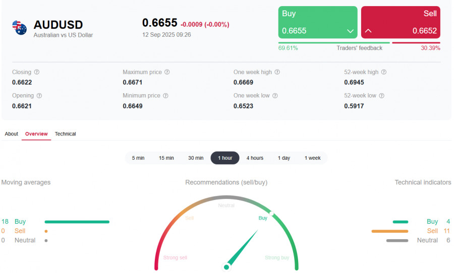 Доллар оказался под мощным медвежьим давлением после всех публикаций этой недели. Тем не менее в ходе сегодняшней азиатской торговой сессии доллар пытался стабилизироваться после сильного падения, в то время как внимание участников рынка переключается на публикацию сегодня (в 14:00 GMT) предварительного индекса потребительских настроений от Университета Мичигана за сентябрь. Пожалуй, он и станет основным драйвером движения в конце торгового дня и уходящей недели (см. наш сегодняшний обзор «Доллар: в конце насыщенной событиями недели»). Одной же из основных мажорных валютных пар, в которых в наибольшей степени отразилась динамика рынка и доллара США, стала, пожалуй, пара AUD/USD. Кроме слабости американского доллара на динамику пары AUD/USD также наложило отпечаток укрепление доллара австралийского, получившего мощную поддержку от позитивной макро статистики из Австралии. *) см. также: Торговые индикаторы InstaForex по AUD/USD[/i] Недавние сильные экономические показатели Австралии снизили вероятность дальнейшего снижения ставок Резервным банком Австралии. Участники рынка оценивают вероятность сохранения политики без изменений в сентябре почти в 86%. Пока что прогнозируется снижение ставки РБА на 25 б.п. в ноябре, с последующими двумя снижениями в 2026 году, что резко контрастирует с ожиданиями рынка в отношении перспектив снижения процентной ставки ФРС с ожиданиями трех снижений в этом году, усиленных слабыми данными по занятости и инфляции. Стабильное же состояние экономики Австралии стимулирует инвестиции в денежный рынок, что также позитивно для национальной валюты. Поддержка для AUD: