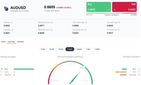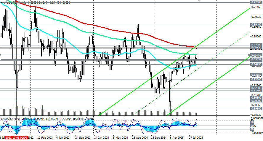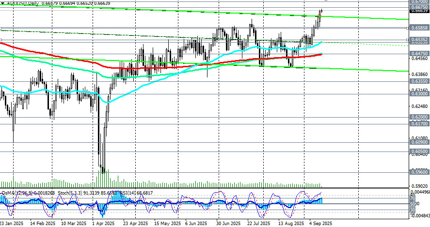 Опасения по инфляции в Австралии Ожидания потребительской инфляции в Австралии выросли до 4,7% в сентябре с 3,9% в августе. Это связано с более сильным внутренним спросом и усиливает опасения по поводу возобновления инфляционного давления. Глава РБА Мишель Буллок отметила недавно «немного больший рост» инфляции в частном секторе. Техническая картина AUD/USD торгуется на текущий момент в зоне среднесрочного бычьего рынка (выше ключевого уровня поддержки 0.6475 – 200-периодная скользящая средняя на дневном графике) и вблизи отметки 0.6660. Впрочем, для выхода и в зону долгосрочного бычьего рынка цене необходимо преодолеть зону ключевых уровней сопротивления 0.6675 (200-периодная скользящая средняя на недельном графике) и 0.6700 (50-периодная скользящая средняя на месячном графике и верхняя граница восходящего канала на недельном графике). Ниже этих уровней сопротивления для AUD/USD остается все же вероятность возврата в нисходящий тренд (подробнее о динамике цены см. в обзоре «[i]AUD/USD: торговые сценарии на 26.08.2025»). Вывод С технической точки зрения AUD/USD торгуется в зоне среднесрочного бычьего рынка. С другой стороны, ниже ключевых уровней сопротивления 0.6675, 0.6700 пара движется в зоне долгосрочного медвежьего рынка, что сохраняет преимущество коротких позиций в долгосрочном периоде. Зона 0.6675–0.6700 выступает в данном случае ключевой в дальнейшей динамике пары. В среднесрочном же горизонте ее динамика будет во многом зависеть от дальнейших действий ФРС и РБА, геополитических решений в торговой войне США–Китай. Инвесторам следует, как всегда, оценивать риски и, по возможности, диверсифицировать инвестиционные портфели. + открыть торговый счет+ зарегистрироваться в системе копирования сигналов+ инвестировать в ПАММ-системеМатериал предоставлен компанией InstaForex - www.instaforex.com