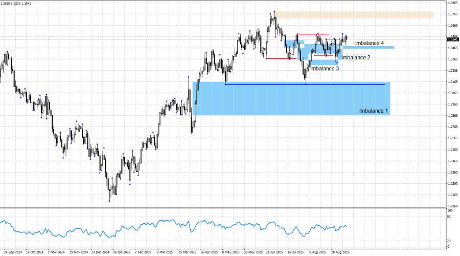 На мой взгляд, текущий информационный фон позволяет рассчитывать на дальнейшее падение американца. Практически все ключевые отчеты по американской экономике в сентябре оказались слабыми. Все говорит о том, что торговая война будет продолжаться еще очень долго, а мы увидим еще не одну ее эскалацию. Надежда медведей может заключаться только в отмене пошлин Трампа Верховным судом США. Давление на ФРС сохраняется, рынок ожидает сильного снижения ставок, а сам FOMC теперь уже вынужден перейти к смягчению ДКП, так как политика Трампа вызвала серьезное снижение на рынке труда. Поэтому я и считаю, что отсутствие падения американской валюты в последние месяц или два – это практически чудо, за которое доллар может благодарить лишь самих трейдеров, которые не спешат с его продажами. «Бычьи» паттерны продолжают отрабатываться, «медвежьих» паттернов попросту нет, оснований ожидать падения пары на текущий момент тоже нет. Сегодня стало известно, что британская экономика вновь «порадовала» нулевыми темпами роста, а британское промышленное производство – сократилось на 0,9%. Таким образом, небольшое падение фунта в течение дня отвечает информационному фону. Новый «бычий» имбаланс 4 выступает теперь единственной зоной поддержки для цены. Реакция трейдеров на этот имбаланс – новая возможность для трейдеров открывать покупки. На мой взгляд, сейчас нет причин ожидать даже новый коррекционный откат. По техническим и графическим причинам трейдеры-быки всегда могут немного отступить, однако в этом случае нужны технические и графические сигналы о будущем падении. Хоть что-то! А сейчас нет ничего «медвежьего». Давление Дональда Трампа на ФРС, фиктивные увольнения чиновников, вечная критика Джерома Пауэлла и продолжающая торговая война – это те, факторы, которые не позволяют мне прогнозировать рост доллара. В общем и целом, могу сказать следующее. В «медвежий» тренд по британцу я не верю точно также, как в «медвежий» тренд по европейцу. Уже в сентябре ФРС может возобновить процесс смягчения ДКП, а рынок опасается, что FOMC потеряет свою независимость, после чего ставка полетит вниз со скоростью света. Если медведи и перейдут в наступление без видимых причин, то нужны хотя бы «медвежьи» паттерны, чтобы идентифицировать такое наступление. В новый рост выше пиков июля верится гораздо легче. Возможно, быки не спешат с наступлением, потому что ожидают отмену пошлин Трампа Верховным судом... В таком случае нужно ждать вердикта Верховного суда. Текущий «бычий» тренд можно будет считать завершенным лишь ниже двух лоу (от 12 мая и 1 августа). Эти лоу практически одинаковые. Только ниже них произойдет слом «бычьей» структуры. Однако для меня очевидна простая истина – без информационной поддержки любое «медвежье» начинание имеет крайне низкие шансы. Календарь новостей для США и Евросоюза: 15 сентября календарь экономических событий не содержит в себе ни одной интересной записи. Влияние информационного фона на настроение рынка в понедельник будет отсутствовать. Прогноз по GBP/USD и советы трейдерам: По британцу картина является достаточно сложной за счет большого количества паттернов, съемов ликвидности и нахождения цены в ограниченном пространстве. «Медвежий» имбаланс 2 превратился в «бычий», а от «бычьего» имбаланса 3 цена уже получила двойную реакцию с д