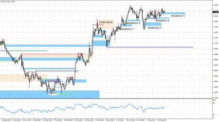 Информационный фон на этой неделе достаточно слабый, но даже его было вполне достаточно, чтобы доллар продолжал процесс падения. Напомню, что уже на следующей неделе FOMC официально объявит о снижении процентной ставки. У Трампа не получилось уволить Лизу Кук, поэтому большая часть FOMC все еще остается «ястребиной». Тут бы доллару вздохнуть более свободно, но расслабляться ему вряд ли придется. Если американская валюта в последние два месяца обошлась без нового падения, это лишь благодаря самим трейдерам, которые взяли паузу. Трамп не перестанет требовать от ФРС снижения ставки, не оставит попытки переформировать комитет FOMC. Таким образом, рано или поздно, быстро или медленно ставки будут снижаться. Каждое такое падение ставки – это новый гвоздь в крышку гроба американской валюты. Новый «бычий» имбаланс 5 образовался в прошлую пятницу, а имбаланс 3 остается незаполненным. Для отработки имбаланса 3 нужен сильный информационный фон из США, которого, как мы видим, по-прежнему нет. Таким образом, от имбаланса 5 есть смысл ожидать новый рост евровалюты. В новый «медвежий» тренд я по-прежнему не верю. Информационный фон, во-первых, крайне сложно интерпретировать в пользу доллара, а во-вторых, он попросту не изменился в последнее время, чтобы ожидать резкую смену в настроении трейдеров. По паре постоянно образовываются «бычьи» паттерны, которые трейдеры не игнорируют. Таким образом, серьезных признаков возможного падения пары в ближайшее время я не вижу. Ни графических, ни информационных. Трейдеры по-прежнему не упускают из виду торговую войну Трампа и его давление на FOMC. Вряд ли такой информационный плацдарм поможет медведям сформировать целый тренд. «Бычья» структура тренда не нарушена, никаких оснований ждать сильный рост американской валюты нет. Синяя линия показывает ценовой уровень, ниже которого можно будет считать «бычий» тренд завершенным. Как видим, до него медведям нужно пройти вниз еще около 650 пипсов, что вряд ли выполнимо в ближайшее время. Ближайшей целью для роста европейской валюты может выступать только «медвежий» имбаланс 1,1976 – 1,2092 на недельном графике, который был образован еще в июне 2021 года. Все атаки медведей за последнее время получились слабыми, так как информационный фон крайне редко им сопутствует. Быки тоже не спешат атаковать, выжидая наиболее подходящего момента. Но так или иначе евровалюта продвигается наверх. Календарь новостей для США и Евросоюза: Евросоюз – Выступление президента ЕЦБ Кристин Лагард (06-10 UTC). 15 сентября календарь экономических событий содержит в себе одну запись, которая не имеет особого значения. Влияние информационного фона на настроение рынка в понедельник будет слабым. Прогноз по EUR/USD и советы трейдерам: На мой взгляд, пара может находиться на завершающем этапе «бычьего» тренда, однако по-прежнему зависима от информационного фона. Пока торговая война не перейдет в стадию умиротворения, а по ДКП FOMC назревает серьезное смягчение, трейдеры-медведи будут оставаться в незавидном положении. Тренд в данное время остается «бычьим», поэтому продажи сейчас не могут быть главнее покупок. От имбалансов 1 и 2 трейдеры имели возможность покупать евровалюту. В обоих случаях мы увидели рост. Двумя зонами для новых покупок, с моей точки зрения, выступали «перевернутый имбаланс» (3) и имбаланс 4. 