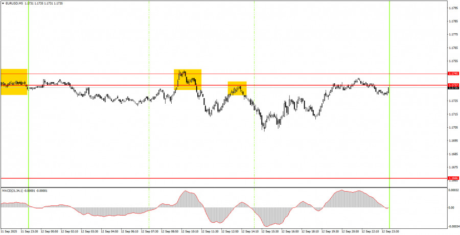 На 5-минутном ТФ в пятницу было сформировано два торговых сигнала на продажу в виде отскоков от области 1,1737-1,1745. Из-за крайне низкой волатильности целевой уровень 1,1666 не был достигнут и даже не имел никаких шансов на отработку. Закрыть сделки в прибыли можно было только вручную. По обеим сделкам можно было выставить Stop Loss в ноль, чтобы избежать любых возможных убытков.Как торговать в понедельник:
