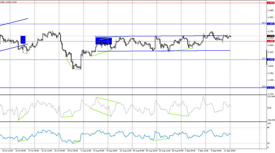 Ситуация с волнами на часовом графике остается простой и понятной. Последняя завершенная волна вверх пробила пик предыдущей волны, а последняя волна вниз не пробила предыдущий лоу. Таким образом, в данное время тренд является «бычьим», хоть и не очень сильным и уверенным. Последние данные по рынку труда и изменившиеся перспективы ДКП ФРС поддерживают только трейдеров-быков. В пятницу важных отчетов было немного. Инфляция в Германии поднялась до 2,2% г/г по итогам августа, но ЕЦБ уже оповестил рынки о том, что в ближайшее время проводить смягчение ДКП больше не намерен. Однако и сильного роста инфляции регулятор также не ожидает, поэтому, вероятнее всего, этот показатель будет и дальше «болтаться» около 2%, не причиняя никому дискомфорта. В Америке вышел индекс настроения потребителей от Мичиганского университета, который вновь снизился, но трейдеры уже отдыхали и ждали новую неделю. На этой неделе состоится несколько выступлений президента ЕЦБ Кристин Лагард и заседание ФРС. Заседание ФРС и определит дальнейшее движение пары. Сейчас вопрос можно задать следующим образом: сколько раз понизит до конца года ставку ФРС? Базовый сценарий – дважды, «голубиный» сценарий – трижды. Трейдеры склоняются к «голубиному» сценарию, поэтому комментарии Джерома Пауэлла будут очень важны. Однако я не думаю, что президент ФРС будет давать какие-либо прогнозы. Вероятнее всего, он ограничиться стандартной фразой «решения ФРС будут зависеть от экономических данных».