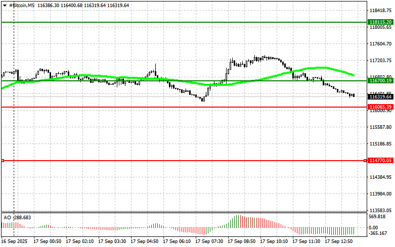Сценарий №2: покупать биткоин можно от нижней границы $116 000 при отсутствии рыночной реакции на ее пробой в обратную сторону к уровням $116 700 и $118 100.