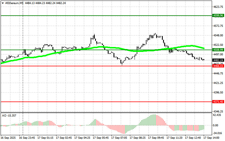 Сценарий №2: покупать эфир можно от нижней границы $4466 при отсутствии рыночной реакции на ее пробой в обратную сторону к уровням $4508 и $4599.