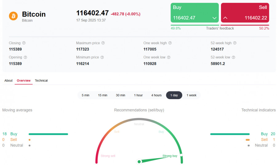 В августе, на фоне активных обсуждений сентябрьского решения ФРС, биткоин достигал исторического максимума около 124500.00, но завершил месяц снижением на 13% от пика. Между тем, аналитики крипторынка подчеркивают, что процентная ставка — не единственный фактор, влияющий на ценовой тренд биткоина. Даже снижение ставки может не привести к росту цен, если оно будет обусловлено экономической слабостью, а высокая инфляция и общая осторожность инвесторов будут ограничивать их готовность к риску. Вывод Рынок внимательно следит за действиями ФРС, но важно помнить, что комплекс экономических факторов и настроения инвесторов играют не менее важную роль в формировании будущей динамики крипторынка. В целом же, основным сценарием, по нашему мнению, остается все же дальнейший рост биткоина. Прорыв сегодняшнего «хая» выше 117320.00 может вновь открыть дорогу в сторону недавних рекордных максимумов вблизи 124500.00. Коррекция же, если она последует за решениями и прогнозами ФРС, будет, скорее всего, ограничена зоной поддержки вокруг уровней 11500.00, 113500.00 (подробнее см. в BTC/USD: сценарии динамики на 17.09.2025).Материал предоставлен компанией InstaForex - www.instaforex.com