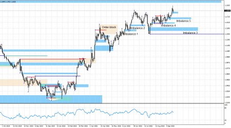 Судить мы можем только по графику «dot-plot», согласно которому теперь члены FOMC допускают чуть более сильное снижение ставки в течение ближайшего года. Однако хочу напомнить, что ФРС четко следует за экономическими данными, а не ставит перед собой определенную цель по ставке, как было в случае с инфляцией. Таким образом, все решения будут зависеть от инфляции, Nonfarm Payrolls, уровня безработицы и общего состояния экономики. В любом случае, если раньше рынок ждал 2 снижения до конца года, а сейчас 3 (с учетом вчерашнего), то трейдеры-быки получают новые поводы продолжать атаки. Последний «бычий» имбаланс 5 был отработан и дал реакцию цены на прошлой неделе. Таким образом, это был еще один сигнал на покупку, доступный для трейдеров. Внизу остается еще неотработанный имбаланс 3, но, чтобы добраться до него, нужен сильный для доллара информационный фон. В данное время я даже предположить не могу, какие это должны быть новости, чтобы медведи перешли в наступление. «День заседания ФРС» подарил трейдерам и еще одну возможность зайти в рынок. Посмотрите внимательно на график – во вторник был образован новый «бычий» имбаланс, а в четверг цена была отбалансирована трейдерами внутри него. Таким образом, еще один «бычий» имбаланс дал реакцию, а процесс роста может продолжаться дальше. В новый «медвежий» тренд я по-прежнему не верю. Информационный фон, во-первых, крайне сложно интерпретировать в пользу доллара, а во-вторых, он попросту не изменился в последнее время, чтобы ожидать резкую смену в настроении трейдеров. По паре постоянно образовываются «бычьи» паттерны, которые трейдеры не игнорируют. Таким образом, серьезных признаков возможного падения пары в ближайшее время я не вижу. Ни графических, ни информационных. Трейдеры по-прежнему не упускают из виду торговую войну Трампа и его давление на FOMC. В данное время Трамп активно продвигает идею новых тарифов для Китая и Индии в рамках компании по завершению войны в Украине. Более того, он требует введения аналогичных тарифов и от Евросоюза, желая объединить усилия против РФ. Вряд ли такой информационный плацдарм поможет медведям сформировать тренд. «Бычья» структура тренда не нарушена, никаких оснований ждать сильный рост американской валюты нет. Синяя линия показывает ценовой уровень, ниже которого можно будет считать «бычий» тренд завершенным. Как видим, до него медведям нужно пройти вниз около 430 пипсов, что вряд ли выполнимо в ближайшее время. Ближайшей целью для роста европейской валюты может выступать только «медвежий» имбаланс 1,1976 – 1,2092 на недельном графике, который был образован еще в июне 2021 года. Календарь новостей для США и Евросоюза: 19 сентября календарь экономических событий не содержит в себе ни одной интересной записи. Влияние информационного фона на настроение рынка в пятницу будет отсутствовать. Прогноз по EUR/USD и советы трейдерам: На мой взгляд, пара может находиться на завершающем этапе «бычьего» тренда, однако по-прежнему зависима от информационного фона. Торговая война остается в «горячей фазе», а по ДКП FOMC назревает серьезное смягчение. Таким образом, трейдеры-медведи остаются в незавидном положении, поэтому о завершении «бычьего» тренда сейчас речи не идет. От имбалансов 1 и 2 трейдеры имели возможность покупать евровалюту. В обоих случаях мы увидели рост. Двумя зонами для н