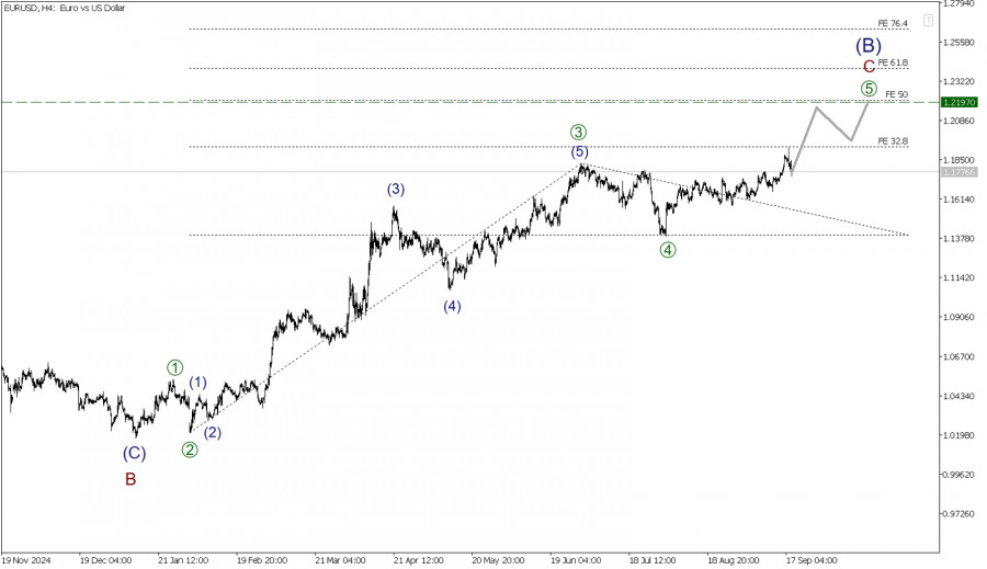 Рынок по Евродоллару в долгосрочной перспективе может формировать крупную бычью коррекция (B), которая принимает форму стандартного зигзага A-B-C. На сегодняшний день полностью завершены только первые две его части - импульс A и коррекция B. На последнем участке графика мы можем наблюдать развитие бычьей волны C, которая, по всей видимости, принимает форму импульса. На текущий момент завершены первые четыре его части - подволны [1]-[2]-[3]-[4]. В процессе построения ,бычья финальная подволна [5]. Большая вероятность, что быки внутри волны [5] смогут отправить рынок в область уровня 1.219. На указанной отметке величина крупной импульсной волны [5] составит 50% по расширению Фибоначчи от предыдущей импульсной волны [3]. Таким образом, при продолжении роста, стоит рассмотреть открытие длинных позиций с текущего уровня, с целью забрать прибыль на указанной отметке. После достижения уровня 1.208, ожидается смена тренда, а именно ожидается развитие финального медвежьего импульса (C). В текущей ситуации рекомендуется рассматривать откыртие длинных позиций. Торговые рекомендации: Buy 1.177, takeprofit 1.219.