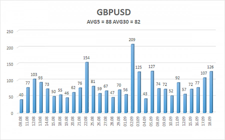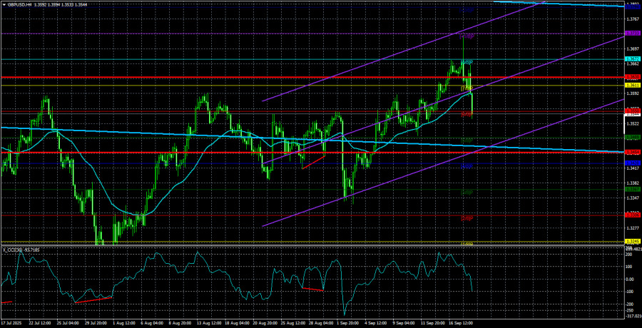 Валютная пара GBP/USD в четверг также легко и просто вернулась на исходные позиции. Как выяснилось позже, для того чтобы продолжить падение. Напомним, что во вчерашних статьях мы призывали «считать цыплят по осени» и не спешить с выводами и переоценкой технической картины. Доллар может показать рост, но рост доллара может быть только коррекционным в текущих обстоятельствах. Позиция ФРС по монетарной политике практически полностью совпала с ожиданиями трейдеров, поэтому, по сути, ни для продаж, ни для покупок оснований не было никаких. Джером Пауэлл занял позицию ровно такую же, какую он занимает на каждом заседании. А именно: решения ФРС будут зависеть всецело от макроэкономических данных, а решение по ставкам будет приниматься от заседания к заседанию без какого-либо четкого графика. Пауэлл не стал отрицать, что до конца года ФедРезерв может пойти на еще два снижения ключевой ставки, но в то же время и не говорил, что это теперь базовый сценарий. Мы также отмечали, что если рынок труда начнет восстанавливаться в ближайшее время, а инфляция продолжит разгоняться, то ФРС будет вновь вынужден брать паузу. Таким образом, никаких новых выводов после заседания американского регулятор сделать просто нельзя. «Голубиные» ожидания рынка, конечно же, выросли, но они остаются высокими еще с начала 2024 года, когда трейдеры ждали 7 снижений ставки. Еле-еле дождались 3. Поэтому это – не новость. А самое главное вообще никак не связано с заседанием ФРС. Нужно лишь ответить на вопрос: чего ожидать от доллара при снижении ставки ФРС и сохранении ставок ЕЦБ и БА, если доллар валился вниз камнем в противоположной ситуации? Ответив на этот вопрос, можно с легкостью понять, что так или иначе американская валюта и дальше будет только обесцениваться. Вопрос лишь в темпах снижения, которые будут зависеть от темпов смягчения монетарной политики. Теперь перейдем к Банку Англии, который вообще ничем трейдеров не удивил. Ключевая ставка осталась без изменений, расклад голосов среди членов Монетарного комитета полностью соответствовал прогнозам – 7 против 2. Так как инфляция в Великобритании за последний год выросла в два раза, то в ближайшее время нет никакого смысла ожидать от Британского регулятора смягчения монетарной политики. Единственное решение, которое можно отметить – это сокращение планируемого объема ценных бумаг на балансе со 100 млрд фунтов в год до 70 млрд фунтов. Что это означает? Это означает, что Банк Англии будет продавать казначейские облигации и другие ценные бумаги меньшими темпами, чем ранее. Следовательно, изымать лишнюю ликвидность с открытого рынка он будет медленнее. В принципе, это решение ни на что не влияет, так как Банк Англии продолжает этим способом бороться с высокой инфляцией. Чем больше в обороте денег, тем быстрее растут цены. В любом случае речь идет о сокращении денежной массы в обращении. Как и в случае с ФРС, мы призываем не делать поспешных выводов о реакции рынка, а дождаться, когда это событие будет полностью учтено трейдерами. Средняя волатильность пары GBP/USD за последние 5 торговых дней составляет 88 пунктов. Для пары фунт/доллар это значение является «средним». В пятницу, 19 сентября, таким образом, мы ожидаем движения внутри диапазона, ограниченного уровнями 1,3454 и 1,3630. Старший канал линейной регрессии направлен вверх, 
