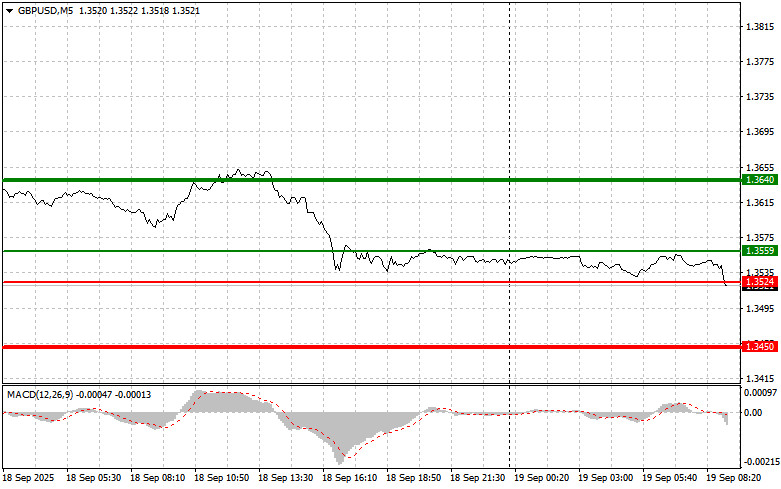 Сценарий №2: покупать фунт сегодня также планирую в случае двух подряд тестов цены 1.3524 в момент, когда индикатор MACD будет находиться в области перепроданности. Это ограничит нисходящий потенциал пары и приведет к обратному развороту рынка вверх. Можно ожидать рост к противоположным уровням 1.3559 и 1.3640.