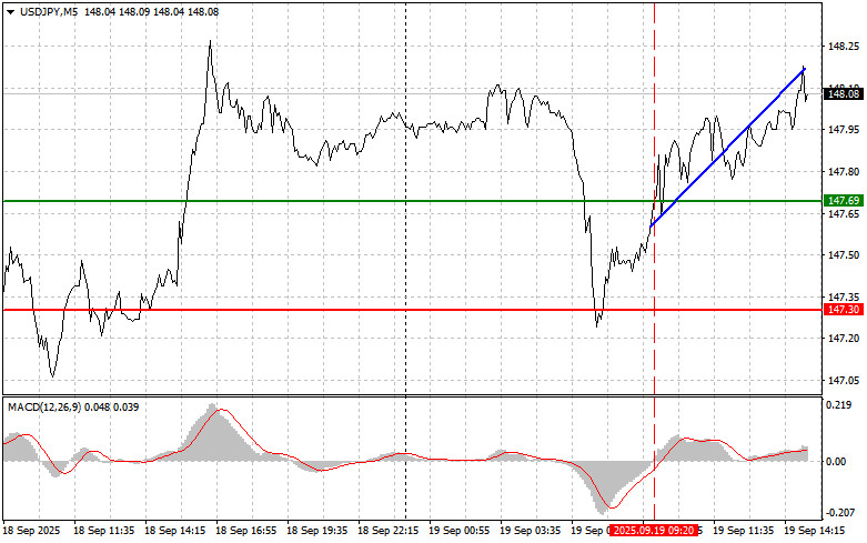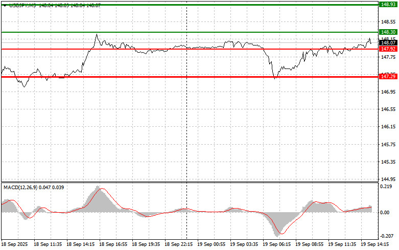 Сценарий №2: покупать USD/JPY сегодня также планирую в случае двух подряд тестов цены 147.92 в момент, когда индикатор MACD будет находиться в области перепроданности. Это ограничит нисходящий потенциал пары и приведет к обратному развороту рынка вверх. Можно ожидать рост к противоположным уровням 148.30 и 148.93.