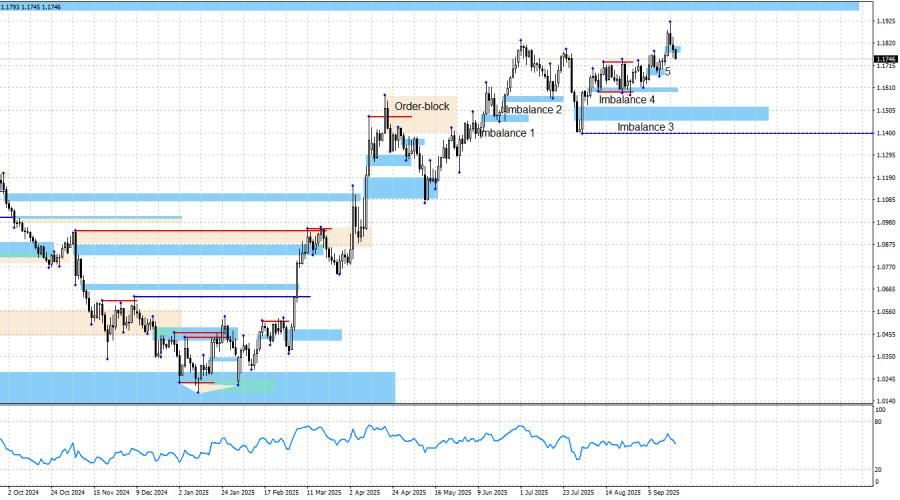 Вкратце напомню об информации, поступившей на этой неделе. Из важных данных в Евросоюзе и США стоит отметить только заседание ФРС, итоги которого, по всеобщему мнению, оказались более «голубиными», чем ожидалось. Трейдеры и до заседания предполагали, что регулятор может до конца года трижды понизить процентную ставку, но после заседания FOMC и выступления Пауэлла ожидания переросли в уверенность. И я не могу сказать, что Джером Пауэлл дал повод рынку считать именно так. Речь президента FOMC вновь была достаточно пространной и размытой. В ней не было никаких упоминаний следующих двух заседаний и тех шагов, которые, возможно, будут предприняты. Таким образом, если пара EUR/USD продолжила процесс роста, я бы сказал, что все закономерно. Последний «бычий» имбаланс 5 был отработан и дал реакцию цены на прошлой неделе. Таким образом, это был еще один сигнал на покупку, доступный для трейдеров. Внизу остается еще неотработанный имбаланс 3, но, чтобы добраться до него, нужен сильный для доллара информационный фон. В данное время я даже предположить не могу, какие это должны быть новости, чтобы медведи перешли в наступление. Но как показывает вторая половина текущей недели, медведи вдруг ощутили прилив сил, который позволяет им атаковать. Последний «бычий» имбаланс, который был образован на этой неделе, инвалидирован. И это первый и пока что единственный признак возможного разворота тренда вниз. На мой взгляд, для «медвежьего» тренда нужно хотя бы что-то, что позволяло бы предполагать укрепление доллара на 500-600 пипсов или более. Сейчас я не вижу ничего подобного. В новый «медвежий» тренд я по-прежнему не верю. Информационный фон, во-первых, крайне сложно интерпретировать в пользу доллара, а во-вторых, он попросту не изменился в последнее время, чтобы ожидать резкую смену в настроении трейдеров. Таким образом, я считаю, что мы увидим коррекционный откат, а затем процесс роста вновь будет возобновлен. Трейдеры по-прежнему не упускают из виду торговую войну Трампа и его давление на FOMC. В данное время Трамп активно продвигает идею новых тарифов для Китая и Индии в рамках компании по завершению войны в Украине. Более того, он требует введения аналогичных тарифов и от Евросоюза, желая объединить усилия против РФ. Вряд ли такой информационный плацдарм поможет медведям сформировать тренд. «Бычья» структура тренда не нарушена, никаких оснований ждать сильный рост американской валюты нет. Синяя линия показывает ценовой уровень, ниже которого можно будет считать «бычий» тренд завершенным. Как видим, до него медведям нужно пройти вниз около 350 пипсов, что вряд ли выполнимо в ближайшее время. Ближайшей целью для роста европейской валюты может выступать только «медвежий» имбаланс 1,1976 – 1,2092 на недельном графике, который был образован еще в июне 2021 года. Календарь новостей для США и Евросоюза: 22 сентября календарь экономических событий не содержит в себе ни одной интересной записи. Влияние информационного фона на настроение рынка в понедельник будет отсутствовать. Прогноз по EUR/USD и советы трейдерам: На мой взгляд, пара может находиться на завершающем этапе «бычьего» тренда, однако по-прежнему зависима от информационного фона. Торговая война остается в «горячей фазе», а по ДКП FOMC назревает серьезное смягчение. Таким образом, трейдеры-медведи остаются в незави