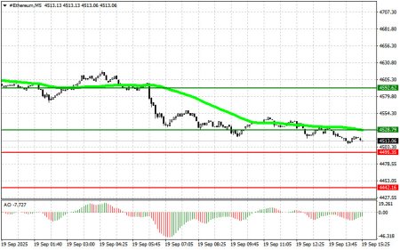 Сценарий №2: покупать эфир можно от нижней границы $4495 при отсутствии рыночной реакции на ее пробой в обратную сторону к уровням $4528 и $4592.