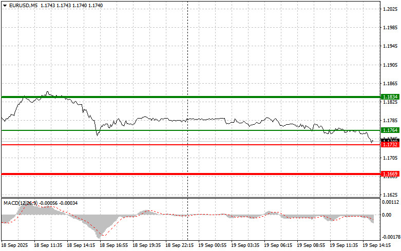 Сценарий №2: покупать евро сегодня также собираюсь в случае двух подряд тестов цены 1.1732, в момент, когда индикатор MACD будет находиться в области перепроданности. Это ограничит нисходящий потенциал пары и приведет к обратному развороту рынка вверх. Можно ожидать рост к противоположным уровням 1.1764 и 1.1834.