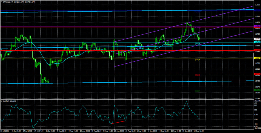 Валютная пара EUR/USD в течение пятницы продолжала нисходящее движение, которое началось еще в среду вечером. По истечение этих 2,5 дней нельзя сказать, что европейская валюта сильно подешевела, а доллар – значительно укрепился. Тем не менее, цена закрепилась ниже скользящей средней линии, что, как минимум, не позволяет в ближайшее время рассматривать наиболее логичные длинные позиции. Несмотря на падение пары EUR/USD в последние дни прошлой недели, наши ожидания абсолютно не изменились. Мы по-прежнему не видим никаких оснований у доллара расти в среднесрочной перспективе. Просто движение вверх уже не такое сильное, как было в первые 6 месяцев текущего года. Доллар все также продолжает дешеветь, но речь идет о валютном рынке – одном из крупнейших в мире. Американская валюта, которая еще не потеряла полностью статус «тихой гавани», просто не может падать каждый день или каждую неделю. Однако глобальный фундаментальный фон продолжает указывать только на ослабление доллара США. Что изменила прошлая неделя? Мы считаем, что ничего. Наиболее важное событие – заседание ФРС – дало возможность трейдерам сделать вывод лишь о том, что их «голубиные» ожидания были не напрасными. ФРС действительно теперь настроена на еще два снижения ключевой ставки до конца года, что превышает ее же собственные прогнозы в начале года. А что будет в 2026 году и даже в ближайшие месяцы при Дональде Трампе, не знает никто. Напомним, что рынок труда может продолжить сокращаться, потому что одно снижение ключевой ставки вряд ли его спасет. Инфляция может продолжать расти, так как импортные пошлины Трампа ни один суд США отменить не пожелал. Сам Трамп может ввести новые пошлины против Индии и Китая, а также требует введения аналогичных пошлин от Евросоюза. В то же время, в начале ноября большая часть пошлин может быть признана незаконной уже Верховным судом, который является последней инстанцией. Поэтому даже в ближайшие несколько месяцев макроэкономические показатели и глобальные события могут крайне сильно влиять на монетарную политику ФРС. И это мы не говорим еще о действиях самого Трампа, который(в этом практически никто не сомневается) продолжит всеми силами стараться «отформатировать» состав FOMC. Это процесс небыстрый, но он в конечном итоге может дать свои плоды. Когда рынок почувствует, что ФРС теряет независимость, а ставка вот-вот полетит вниз со скоростью света, доллар может вновь полететь в пропасть. Также отметим, что на недельном ТФ пара отскочила от глобальной нисходящей линии тренда, а на 4-часовом ТФ индикатор CCI заходил в область перекупленности. «Медвежью» услугу евровалюте оказал фунт стерлингов, которые на основании своих собственных проблем сильно подешевел в конце недели и просто потянул за собой евро вниз. Однако мы считаем, что в данное время наблюдается очередная техническая коррекция. Средняя волатильность валютной пары EUR/USD за последние 5 торговых дней по состоянию на 22 сентября составляет 90 пунктов и характеризуется, как «средняя». Мы ожидаем движение пары между уровнями 1,1656 и 1,1836 в понедельник. Старший канал линейной регрессии направлен вверх, что по-прежнему указывает на восходящую тенденцию. Индикатор CCI заходил в область перекупленности на прошлой неделе, что и могло спровоцировать новый виток нисходящей коррекции. Ближайшие уров