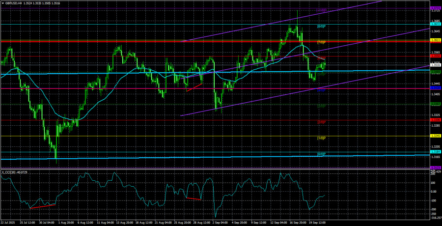 Валютная пара GBP/USD во вторник большую часть дня простояла на одном месте. В Великобритании вчера были опубликованы индексы деловой активности в секторах услуг и производства, но они спровоцировали лишь конвульсии цены на одном месте. Хотя очень странно, ведь оба индекса деловой активности не только упали по итогам сентября, но и оказались значительно ниже прогнозных значений. Выходит, что у британского фунта вчера имелись основания в первой половине дня для падения. Почему же тогда фунт стерлингов не продолжил падение, если в предыдущие несколько дней падал так активно? Мы уже говорили, что падение британской валюты спровоцировали новые бюджетные проблемы британского правительства. А падение европейской валюты спровоцировало падение британского фунта. Таким образом, если бы не новые проблемы с бюджетом, фунт стерлингов преспокойно продолжал бы восходящее движение. Напомним, что итоги заседания ФРС можно с уверенностью считать «голубиными», а вот результаты заседания Банка Англии – «нейтральными». Иными словами, Американский регулятор просигнализировал о готовности снижать ставку и дальше, а Банк Англии – нет. Конечно, сколько аналитиков и трейдеров, столько и мнений. Кто-то усмотрел в заседании Банка Англии «голубиные нотки», но мы так не считаем. Причина падения фунта очевидна, поэтому не нужно придумывать велосипед. Тем более, что на помощь всегда придет технический анализ, который подскажет, чего ожидать в ближайшем будущем. И тот факт, что британский фунт обошелся без падения тогда, когда имел все шансы его продолжить, указывает на весьма вероятное завершение нисходящей коррекции. Напомним, что инфляция на Туманном Альбионе, если и не зашкаливает, то превышает целевой уровень почти в 2 раза. Мы считаем, что с такой инфляцией даже третьего смягчения монетарной политики в 2025 году быть не должно было. А уж о четвертом и говорить нет смысла. Кто-то может считать, что слабость британской экономики может вынудить БА снижать ставки далее, но мы хотим напомнить, что британская экономика проявляется слабость с 2016 года. Этот феномен возник явно не в последнее время. Все последние годы и регулятор, и правительство как-то мирилось со слабыми темпами экономического роста. Почему вдруг сейчас требуется срочное вмешательство центрального банка? Также напомним, что с бюджетом у Британии большие проблемы. Расходы растут, доходы – нет. Выход один – «резать» социальные, медицинские программы, повышать налоги. Мы не можем сказать, что для британского фунта это очень плохие новости, ибо в противовес всегда будет работать фактор американской экономики, где тоже проблем хватает. В любом случае снижение ключевой ставки еще раз практически гарантированно приведет к росту инфляции. Либо Банку Англии придется отказаться от таргетирования инфляции, либо же он не сможет снижать ключевую ставку. Что для британского фунта очень хорошо. Средняя волатильность пары GBP/USD за последние 5 торговых дней составляет 89 пунктов. Для пары фунт/доллар это значение является «средним». В среду, 24 сентября, таким образом, мы ожидаем движения внутри диапазона, ограниченного уровнями 1,3427 и 1,3605. Старший канал линейной регрессии направлен вверх, что указывает на однозначную восходящую тенденцию. Индикатор CCI вновь заходил в область перепроданности, что еще раз 