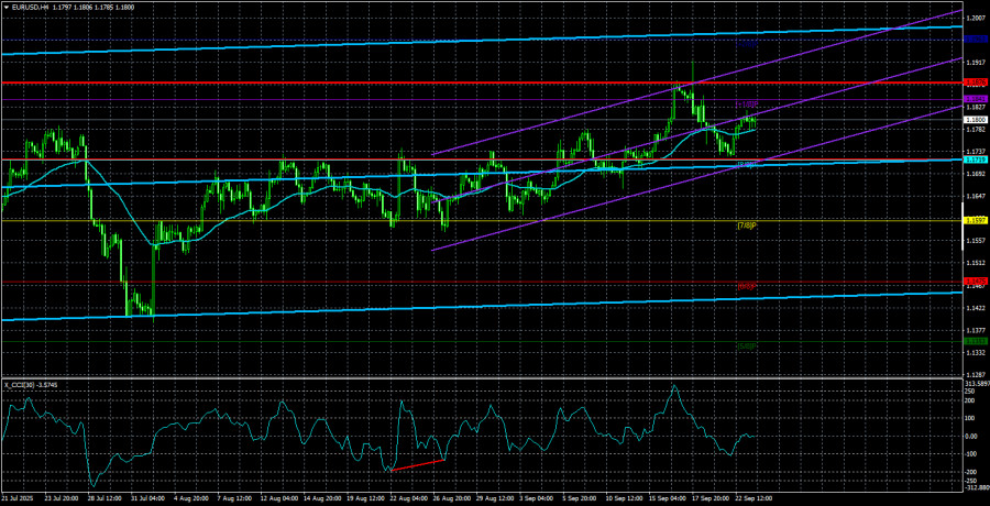 Валютная пара EUR/USD в течение вторника не нашла никаких причин для активных движений в течение большей части дня. Утром в Евросоюзе и Германии вышли чуть ли не единственные макроэкономические данные на этой неделе, но они(как это часто бывает в последнее время) оказались противоречивыми. Если индексы деловой активности в секторах производства вновь снизились и оказались ниже «ватерлинии» 50,0, то индексы деловой активности в секторах услуг выросли и превысили прогнозы экспертов. А в сумме получились нейтральные значения, поэтому реакции рынка не последовало никакой. Европейская валюта сохраняет восходящий уклон движения, но достаточно слабый. Цена постоянно откатывается вниз, регулярно преодолевает мувинг, что часто только путает трейдеров. Однако к текущему характеру движения участники рынка уже могли привыкнуть, ибо оно длится больше месяца. Таким образом, очередное закрепление цены выше скользящей средней линии может означать, что мы увидим новый виток восходящего движения выше предыдущего локального максимума. В целом нам больше нечего добавить по текущему анализу пары EUR/USD. Положение доллара остается катастрофическим, хоть в последние месяцы он теряет позиции достаточно медленно. Но ведь все равно теряет! Большая часть глобальных фундаментальных факторов продолжает работать против американской валюты, поэтому ничего позитивного она ожидать по-прежнему не может. На наш взгляд, ключевым фактором в данное время остается «дивергенция ставок» между ЕЦБ и ФРС, которая будет в течение следующих месяцев и лет только сокращаться. Если доллар США активно падал при смягчении монетарной политики ЕЦБ, то на что он может рассчитывать при смягчении монетарной политики ФРС? В пользу американской валюты может сыграть только Верховный суд США, который в начале ноября-месяца может окончательно заблокировать большую часть тарифов Дональда Трампа. Если это случится, торговой войне может прийти конец. Однако надолго ли? Сколько пройдет времени прежде, чем Дональд Трамп вернет все пошлины, опираясь при этом просто на другой закон? Сколько еще апелляций подаст Дональд Трамп, чтобы хотя бы замедлить процесс вынесения вердикта? На наш взгляд, торговая война не закончится так просто. Как и война против ФРС. У ФРС козырей на руках меньше, чем у Верховного суда США. Все представители Монетарного комитета рано или поздно уйдут в отставку, а Трампу и не нужно менять весь Комитет. Достаточно перетянуть на свою сторону еще несколько чиновников, чтобы Комитет из заседания в заседание голосовал так, как нужно Белому дому. Таким образом, на этом поприще Трамп может одержать победу, но, скорее всего, уже в 2026 году. Таким образом, до ноября-месяца доллар может чувствовать себя более или менее спокойно. Но так или иначе он все равно будет оставаться под давлением рынка из-за смягчения монетарной политики ФРС. На дневном ТФ отлично видно, что пара растет 9 месяцев подряд и за это время коррекций практически не было. На данный момент по-прежнему нет никаких оснований ожидать укрепления американской валюты. Средняя волатильность валютной пары EUR/USD за последние 5 торговых дней по состоянию на 24 сентября составляет 78 пунктов и характеризуется, как «средняя». Мы ожидаем движение пары между уровнями 1,1720 и 1,1876 в среду. Старший канал линейной регрессии напра