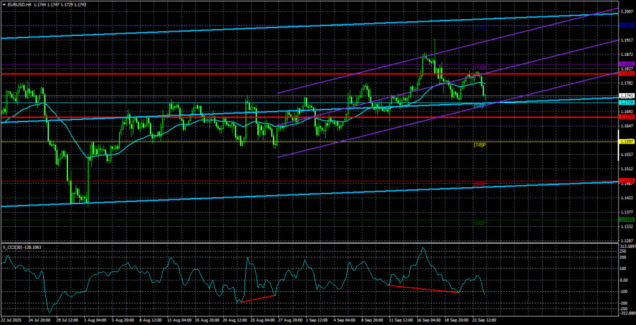 Валютная пара EUR/USD в течение среды неожиданно возобновила нисходящее движение, объяснений чему попросту нет. Как и всегда, найти объяснение постфактум не составляет труда. Всегда можно сказать, что Пауэлл оказался недостаточно «по-голубиному» настроен или же случился «рост антирисковых настроений». Однако это все отговорки, а не анализ. Таким способом можно объяснить что угодно. Мы придерживаемся следующей тактики в анализе. Если событие можно спрогнозировать с высокой долей вероятности, мы это делаем. Если цена движется в другую сторону, мы так и говорим – движение алогичное. Хотим напомнить, что не все на валютном рынке зависит от макроэкономического и фундаментального фона. Валютный рынок – это в первую очередь рынок, где есть покупатели и продавцы. И сделки совершаются на рынке не только когда выступает Джером Пауэлл, Дональд Трамп или кто-либо еще из «первых лиц» мировой экономики. Точно также обстоят дела и с макроэкономическими данными. Рынок торгует не только в дни публикации инфляции или NonFarm Payrolls. Что из этого следует? Из этого следует, что в любой момент какой-нибудь крупный банк может совершить крупную сделку на рынке, что спровоцирует определенное движение. Однако фундаментальный или макроэкономический фон, или же технический анализ могут быть совершенно иными по характеру. И вот мы видим движение, которое абсолютно не соответствует предшествующему событию. Значит движение алогичное. И именно это мы сейчас и наблюдаем. Во вторник вечером состоялось очередное выступление Джерома Пауэлла. Если говорить коротко, то риторика Пауэлла не меняется с течением времени. На прошлой неделе после заседания глава ФРС допустил, что ключевая ставка может быть понижена до конца года еще два раза, однако он не анонсировал подобный вариант. Проще говоря, все будет зависеть от макроэкономических данных, а не от желания отдельных чиновников FOMC или требований Дональда Трампа. Эту мысль Пауэлл транслирует рынку постоянно – все будет зависеть от макроэкономических данных. Другими словами, вариант с еще двумя снижениями ставки до конца года – это лишь один из возможных вариантов, а не утвержденный план. И как тут не вспомнить то, о чем мы в свою очередь постоянно говорим. ФРС не будет спешить со смягчением монетарной политики, потому что спешить абсолютно некуда. Инфляция в США растет, а именно инфляция в последние годы занимала умы чиновников ФРС. Да, в данное время рынок труда США находится не в лучшем состоянии, но кто в этом виноват и почему ФРС должна решать эту проблему? Виновата однозначно политика Дональда Трампа. В частности, иммиграционная политика, которая закрывает доступ рабочим мигрантам и выдворяет уже находящихся в США рабочих. Также виновата торговая политика, которая приводит к замедлению экономики и, следовательно, сокращению производства и деловой активности. Получается Трамп и должен нести ответственность за свои действия, а не сваливать вину на ФРС и Джерома Пауэлла. Средняя волатильность валютной пары EUR/USD за последние 5 торговых дней по состоянию на 25 сентября составляет 68 пунктов и характеризуется, как «средняя». Мы ожидаем движение пары между уровнями 1,1655 и 1,1834 в четверг. Старший канал линейной регрессии направлен вверх, что по-прежнему указывает на восходящую тенденцию. Индикатор CCI заходил в область 