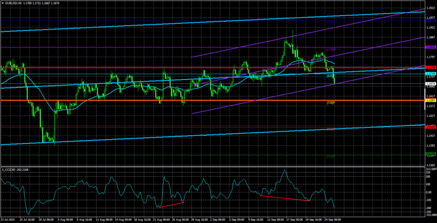 Валютная пара EUR/USD в течение четверга торговалась достаточно спокойно, но днем ранее закрепилась ниже скользящей средней линии еще раз. В принципе, к постоянной чехарде с преодолением мувинга все уже привыкли. В последние полтора месяца характер движения пары таков, что на 100-пунктовый рост приходится 80-пунктовое падение. Иными словами, рост европейской валюты стабильный, но очень слабый, с частыми коррекциями и откатами. К сожалению, при таком характере движения пары скользящие средние практически бесполезны. Более того, такое движение цены обладает признаками тренда и флэта одновременно, что тоже важно понимать. Цена вроде бы движется не вбок, но при этом коррекции занимают до 90% от трендовых движений. Однако любые вопросы улетучиваются, когда переходишь на дневной ТФ. Какое бы движение не было на 4-часовом ТФ, на дневном ТФ прекрасно видно, что европейская валюта растет практически без остановок уже девятый месяц подряд. Да, сейчас движение уже не такое сильное, как в первые 6 месяцев года, но это все равно рост, а коррекций на дневном ТФ как раз практически нет. В глобальном масштабе европейская валюта остается около своих 3-хлетних максимумов. На этой неделе рынок успел пару раз разочароваться. Один из таких моментов – выступление Джерома Пауэлла. Честно говоря, мы до сих пор не понимает, кто и почему ожидает от ФРС самых «голубиных» действий, если представители ФРС уже года полтора, как мантру, повторяют одно и тоже – ставка будет изменяться только на фоне макроэкономических данных. Никто внутри Комитета FOMC не спешил со снижением ставки в начале года, в 2024 году. Никто внутри Комитета FOMC даже не спешил спешить со смягчением монетарной политики. В последние несколько дней тема выступления Пауэлла обхаживается СМИ со всех сторон, а всеобщее, средневзвешенное мнение таково – доллар растет из-за несбыточности «голубиных» ожиданий рынка. Однако, мы считаем, что этот вывод неверен. Во-первых, доллар США практически не растет. Особенно, в паре с европейской валютой. Возможно, британский фунт действительно теряет позиции, но евро находится всего лишь в 150-200 пунктах от своих максимумов за последние 3 года. Во-вторых, ни риторика Джерома Пауэлла, ни настрой Комитета FOMC, ни действия Дональда Трампа в отношении ФРС не приобрели за последнее время новых очертаний. Проще говоря, абсолютно ничего не изменилось. Если ничего не изменилось, то за счет чего ожидать роста доллара? Также хотим напомнить, что в первой половине 2025 года доллар прекрасно валился в пропасть даже при условии снижения ставок ЕЦБ и сохранения ставок ФРС. Сейчас ЕЦБ сохраняет, а ФРС – снижает. Таким образом, с нашей точки зрения, у доллара по-прежнему только один путь – в ад вниз. Просто следует помнить о характере текущего движения с кучей коррекций, откатов и прочих нелицеприятных моментов для трейдеров. Средняя волатильность валютной пары EUR/USD за последние 5 торговых дней по состоянию на 26 сентября составляет 74 пункта и характеризуется, как «средняя». Мы ожидаем движение пары между уровнями 1,1600 и 1,1748 в пятницу. Старший канал линейной регрессии направлен вверх, что по-прежнему указывает на восходящую тенденцию. Индикатор CCI заходил в область перекупленности на прошлой неделе, что и могло спровоцировать новый виток нисходящей коррекции. Ближайшие уровни поддержки: S1 – 1,1