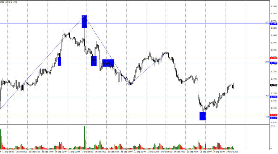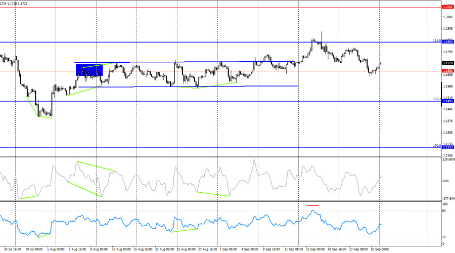 Ситуация с волнами на часовом графике остается простой и понятной. Последняя завершенная волна вниз пробила лоу предыдущей волны, а новая волна вверх не пробила предыдущий лоу. Таким образом, в данное время тренд остается «медвежьим». Последние данные по рынку труда и изменившиеся перспективы ДКП ФРС поддерживают трейдеров-быков, поэтому на этой неделе тренд может начать меняться вновь. Для того, чтобы «медвежий» тренд завершился, требуется закрепление цены выше последнего пика – 1,1819. В пятницу интерес у трейдеров вызвал только индекс настроения потребителей от Мичиганского университета, который снизился до 55,1 пунктов, оказавшись в зоне ниже ожиданий трейдеров. Индекс цен расходов на личное потребление и доходы с расходами американского населения в целом соответствовали прогнозам. Потребительское доверие в США снижается не в первый раз. Хоть это и не самый важный показатель для трейдеров, в пятницу он создал давление на доллар. Параллельно с этим быки перешли в наступление из-за новых торговых пошлин, введенных Дональдом Трампом, а также на фоне угрозы «закрытия» экономики из-за очередного «шатдауна». Также хочу отметить, что все «медвежьи» факторы (которых было не так уж и много) отработаны трейдерами. Таким образом, я жду, что «бычий» тренд засияет новыми красками. На этой неделе важных событий и отчетов будет много, особый интерес вызывают отчеты по рынку труда и безработице в США. От этих данных будет зависеть ДКП FOMC до конца года. Если они окажутся негативными, вероятность дополнительного смягчения ДКП вырастет. Это будет двойной удар по доллару.