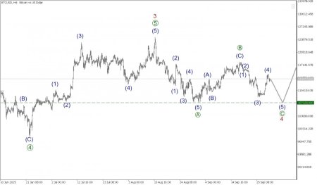 В долгосрочной перспективе по криптовалютной паре BTC/USD может формироваться крупный бычий импульс (1)-(2)-(3)-(4)-(5). Скорее всего, первые четыре части импульсного паттерна полностью завершены. То есть имеются в виду волны (1)-(2)-(3)-(4). Коррекционная волна (4) приняла сложную форму тройного зигзага. На последнем участке графика мы можем наблюдать построение начальной части заключительной импульсной волны, которая будет состоять из подволн 1-2-3-4-5. На текущий момент полностью завершенными смотрятся первые две небольшие подволны 1 и 2, а также более стремительный импульс 3. Также смотрится завершенной коррекционная волна 4, она имеет форму двойного зигзага. В стадии развития может находиться финальная подволна 5. Вполне возможно, что она примет форму импульса, как показано на графике. В первую очередь ожидается подъем цены к предыдущему максимуму 120300.00, на котором ранее была завершена волна связка [X]. Но рассматриваем вариант, в котором уже завершен бычий тренд, как представлено на графике, и уже рынок движется вниз в новом потенциальном импульсе, возможно построение бычьей коррекции 2 окончено, ее величина составила 61.8% от волны 1. На последнем участке графика может формироваться новая импульсная волна 3. В ближайшее время возможно падение в направлении предыдущего минимума 107308.00. Торговые рекомендации: Sell 113777.64, takeprofit 107308.00.