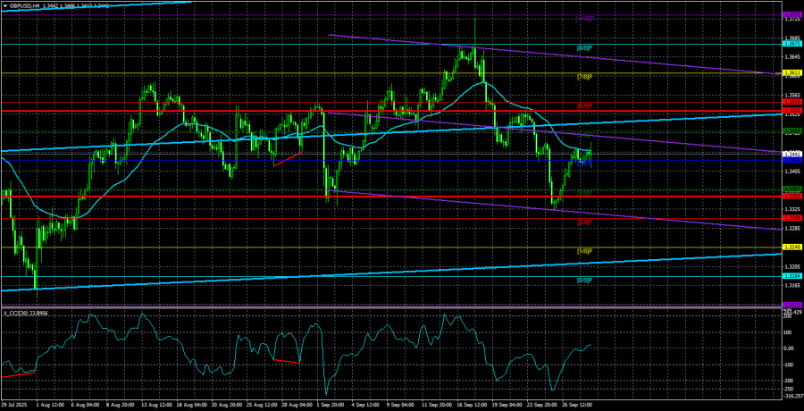 Валютная пара GBP/USD в течение вторника вновь торговалась с минимальной волатильностью. Угроза шатдауна никакого влияния на настроение трейдеров не оказала, хотя, скорее всего, тут дело в другом. Рынок просто не хочет в данное время рисковать и открывать позиции, о которых через пару дней может серьезно пожалеть. Именно этим объясняется низкая активность трейдеров и, соответственно, волатильность. Позиции доллара остаются такими, что врагу не пожелаешь. Доллар падал, как камень, в первой половине 2025 года, когда и ЕЦБ, и БА снижали свои ключевые ставки. Сейчас центральные банки поменялись ролями. Теперь ЕЦБ и БА будут выжидать и сохранять, а ФРС – смягчать. Чего ожидать в этом случае от доллара, наверное, говорить не нужно. Отдельно можно поговорить о торговой войне. Торговая война была одной из главных причин падения американской валюты в 2025 году. В последнее время Трамп не вводил новых тарифов, но в то же время и торговое противостояние считать завершенным не мог никто. Рынок просто надеялся, что худшее уже позади, но Трамп доказал в очередной раз, что «дно» - это понятие растяжимое. Несколько недель назад он повысил пошлины на импорт из Индии до 50% из-за отказа Нью-Дели отказываться от закупок российских нефти и газа. А буквально в конце прошлой недели Трамп ввел тарифы на импорт всех медикаментов, мебели и грозовых автомобилей. При чем, медикаменты будут облагаться по ставке «всего лишь» 100%. Действительно, зачем мелочиться? Таким образом, если кто-либо ожидал, что торговое напряжение будет потихоньку спадать, то очень и очень зря. Ну и как не отметить макроэкономические данные из США и борьбу с ФРС. Новых макроэкономических данных трейдеры могут и не увидеть, если шатдаун действительно начнется 1 октября. Мы не помним, чтобы во время последнего шатдауна, который произошел тоже при Дональде Трампе, Бюро статистики уходило в отпуск, но все же такая вероятность существует. Если отчеты будут опубликованы на этой неделе, то от них крайне сложно ожидать позитивных значений, хотя прогнозы занижены донельзя. По сути, если американская экономика создала в сентябре хотя бы 50 тысяч новых рабочих мест вне сельскохозяйственного сектора(что очень и очень мало), это значение уже можно будет считать позитивным, потому что прогнозы еще ниже. Таким образом, мы даже можем увидеть рост доллара, но от этого американский рынок труда сильнее не станет, ФРС не перестанет снижать ключевую ставку, инфляция не перестанет расти, а Трамп не прекратит свои нападки на ФРС. Честно говоря, понадобится статей 5 или 6, чтобы перечислить и разобрать все факторы дальнейшего падения доллара. Мы бы сказали так: шатдаун – это далеко не самая большая проблема американской валюты. На дневном ТФ видно, что пара корректируется уже пару месяцев, но при этом и признаков завершения восходящего тренда нет никаких. Мы бы сказали, что пара находится в глобальном плане во флэте. Средняя волатильность пары GBP/USD за последние 5 торговых дней составляет 90 пунктов. Для пары фунт/доллар это значение является «средним». В среду, 1 октября, таким образом, мы ожидаем движения внутри диапазона, ограниченного уровнями 1,3352 и 1,3532. Старший канал линейной регрессии направлен вверх, что указывает на однозначную восходящую тенденцию. Индикатор CCI еще раз зашел в область перепроданности, что снова пред