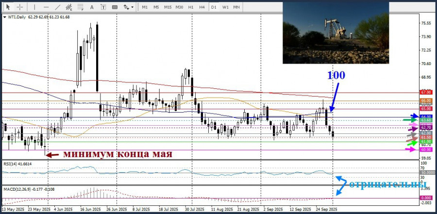 Полноценный пробой области поддержки $61,50–$61,20, последняя отметка соответствуют многомесячному минимуму в сентябре, откроет путь к более глубоким потерям. В дальнейшем давление на цены может усилиться, продвигаясь к круглому уровню $61,00, с возможным падением до психологического уровня $60,00, на пути к минимуму конца мая.
