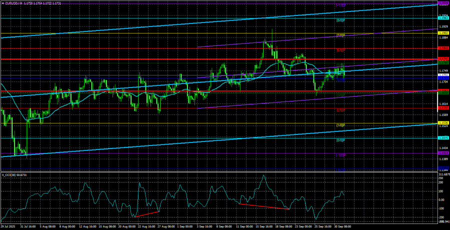 Валютная пара EUR/USD в течение третьего торгового дня недели умудрилась показать нисходящее движение, но в целом характер движения последних дней сохраняется. Это все тот же поступательный рост на младших ТФ. На 4-часовом ТФ такой поступательный рост евро длится уже полтора месяца, поэтому в характере движения абсолютно ничего не поменялось. Евро, как и раньше, тяготеет к росту, но делает это не быстро. Почему? Ответить на этот вопрос не так-то просто, но мы можем предположить, что первая волна паники, связанная с политикой Дональда Трампа, уже завершилась, поэтому далее евро будет расти более спокойно. Или же в один прекрасный момент произойдет «выстрел», и доллар улетит в новую пропасть. Вчерашний день, как и любой другой день на этой неделе, сулил доллару только новые проблемы. А чего еще можно ожидать от американской валюты в текущих обстоятельствах? Среда стала первым днем шатдауна, а сколько он продлится – не знает никто. Конечно, шатдаун – это не закрытие экономики, как во времена коронавируса. Но это закрытие многих государственных учреждений. Работники будут либо уволены, либо уйдут в отпуск за свой счет. Будут ли тратить деньги эти американцы, количество которых может достигать миллиона? Нет, они будут экономить. Также пострадают и многие частные компании, чья деятельность так или иначе зависит от государственных служб. В общем, то, что американская экономика пострадает из-за шатдауна – факт. Вопрос лишь в том, насколько сильно? Тем временем, в Евросоюзе вышел отчет по инфляции за сентябрь. Напомним, что сутками ранее аналогичный отчет был опубликован в Германии, и там показатель превысил прогнозное значение. Многие трейдеры ожидали более высокого значения и по общеевропейской инфляции. Но не дождались, чем были несказанно разочарованы. Инфляция в ЕС составила 2,2%, базовая инфляция – 2,3%. Именно такие значения прогнозировались экспертами. Евро же упал из-за того, что инфляция выросла достаточно слабо, хотя, на наш взгляд, она и не должна(в прямом смысле этого слова) расти, если в последние годы ЕЦБ делал все, чтобы ее понизить. Однако рынок разочаровался именно тем, что инфляция выросла слабо, а значит... ЕЦБ не будет в ближайшее время проводить ужесточение монетарной политики. Да, именно в такой формулировке. Если инфляция будет расти, как в США или в Великобритании, то ЕЦБ будет вынужден рассматривать вариант с повышением процентных ставок, которые в последние 12-15 месяцев он активно снижал. Такой вариант сейчас выглядит абсурдно, но мы бы не стали его исключать. Также обратим внимание, что евро упал, а фунт стерлингов – нет. Следовательно, дело заключалось однозначно в отчете по инфляции. В целом мы бы сказали, что рынок крайне вяло реагирует на все происходящее сейчас в мире, в США и в Европе. Волатильность остается достаточно низкой, как и само движение на любом таймфрейме. Шатдаун пока никакого влияния на курс доллара не оказывает. Средняя волатильность валютной пары EUR/USD за последние 5 торговых дней по состоянию на 2 октября составляет 65 пунктов и характеризуется, как «средняя». Мы ожидаем движение пары между уровнями 1,1657 и 1,1797 в четверг. Старший канал линейной регрессии направлен вверх, что по-прежнему указывает на восходящую тенденцию. Индикатор CCI заходил в область перекупленности, что и спровоцировало новый виток нисход