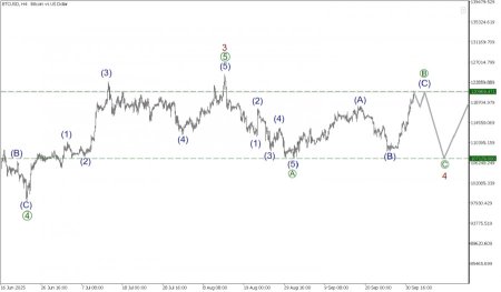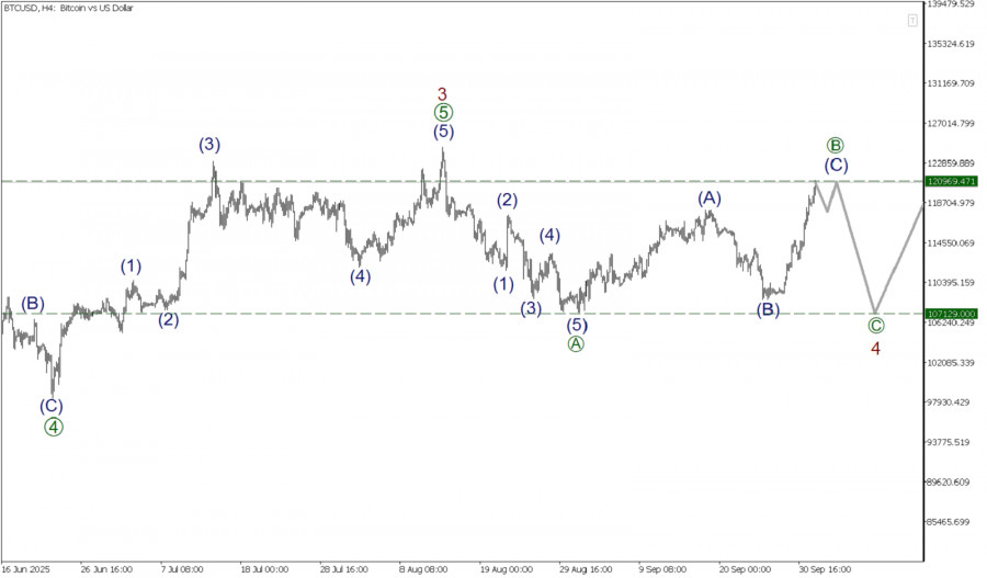 FxSignal 2-10-2025, 22:43 21 Аналитика, прогнозы валютного рынкаВ долгосрочной перспективе по криптовалютной паре BTC/USD может формироваться крупный бычий импульс 1-2-3-4-5. Большая часть указанной фигуры полностью завершена. Сейчас в стадии разработки находится коррекционная волна 4. Волна 4 может принять форму стандартного зигзага [A]-[B]-[C]. На сегодняшний день полностью завершенной смотрится первая импульсная подволна [A]. Возможно, приближается к концу коррекционная подволна [B], эта коррекция может принять форму стандартного зигзага (A)-(B)-(C) и завершиться около максимума 118065. Вполне возможно, что после достижения указанного уровня мы увидим построение медвежьей импульсной волны [C]. Стоимость котировок в импульсе [C] могут упасть в область минимума 107129, который отметила подволна [A]. В текущей ситуации можно рассматривать открытие коротких позиций с целью забрать прибыль на медвежьем импульсном движении в рамках подволны [C]. Торговые рекомендации: Sell 120969.86, takeprofit 107129.00.