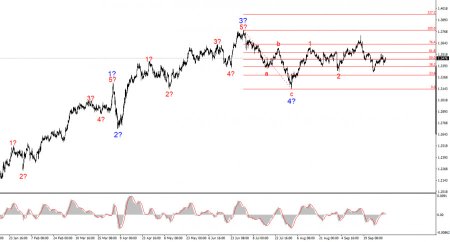 По инструменту GBP/USD волновая разметка продолжает свидетельствовать о построении повышательной структуры волн, и за последнюю неделю она не поменялась. Британец снизился слишком сильно за последнее время, поэтому участок тренда, берущий свое начало 1 августа, теперь выглядит неоднозначно. Первое, что при ходит на ум, это усложнение предполагаемой волны 4 которая примет трехволновой вид, и внутри каждой из ее подволн также будет построено по три волны. В этом случае стоит ожидать снижения инструмента к 31 и 30 фигурам. Однако, если это предположение верно, то европейская валюта тоже будет снижаться и, следовательно, ее волновая структура тоже понесет определенные изменения. Других альтернативных сценариев с понятной структурой я в данное время не вижу. Новостной фон очень сильно помешал реализации наиболее понятного сценария, но в то же время он и дальше должен поддерживаться продавцов, чтобы альтернативный сценарий был реализован. А с этим могут возникнуть проблемы. Следует помнить, что в данное время очень многое на валютном рынке зависит от политики Дональда Трампа. Рынок опасается смягчения политики ФРС из-за давления президента США, а сам Трамп ввел новый пакет пошлин, что указывает на сохранение и продолжение торговой войны. Следовательно, новостной фон остается для доллара неблагоприятным.