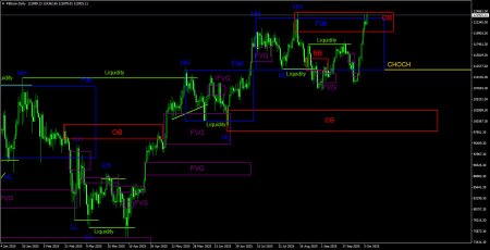 Биткоин остается главным драйвером всего криптовалютного рынка. Именно потому, что биткоин в последние полторы недели растет, растет и весь криптовалютный рынок. Новый виток роста биткоина начался 28 сентября, за несколько дней до начала «шатдауна» в США. Можно предположить, что эти два события связаны друг с другом, но мы считаем, что это не так. Мы считаем, что наблюдается новый памп рынка. Инвесторы скупают криптовалюты и акции по любым ценам, а логики в таких действиях для рядовых трейдеров нет никакой. Также отметим, что биткоин начал новый виток роста не из области POI или от какого-либо «бычьего» паттерна. Ключевым моментом для биткоина на дневном ТФ остается слом восходящей тенденции(преодоление линии CHOCH). Вторым ключевым моментом – «медвежий» OB, в который цена все-таки вернулась. Эти два факта говорят нам о том, что началось формирование нисходящего тренда. К сожалению, за последнее время было сформировано огромное количество «медвежьих» паттернов, но ощутимого падения первой криптовалюты мы так и не увидели. Можно сказать, что в данное время у биткоина последний шанс для того, чтобы отработать два ключевых технических момента. Сам по себе возврат в область OB выглядит вполне закономерным. Если маркет-мейкеры готовятся к нисходящему тренду, то им нужно сначала закрыть все позиции на покупку, которые открывались на снятии ликвидности с последнего ATH. Так как основной сигнал формируется на дневном ТФ, то подтверждение ему следует искать на часовом ТФ. На данный момент слома тенденции на часовом ТФ не было. Сила текущего движения на Север сейчас такова, что OB может быть просто «прошит» ценой.