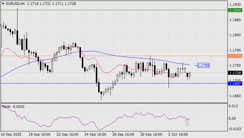 Верхней границей бокового движения становится вершина 1-го октября 1.1779. Закрепление над уровнем откроет цель 1.1910 по верхней границе ценового канала. Цель, тем не менее, может быть не достигнута, если доходности по американским гособлигациям продолжат снижение. Поддержкой является линия Крузенштерна 1.1697. Закрепление под ней откроет цель 1.1605. Осциллятор Марлин продолжает движение вправо по нулевой нейтральной линии.