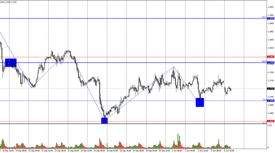 Ситуация с волнами на часовом графике остается простой и понятной. Последняя завершенная волна вниз пробила лоу предыдущей волны, а последняя волна вверх не пробила предыдущий пик. Таким образом, в данное время тренд остается «медвежьим». Последние данные по рынку труда и изменившиеся перспективы ДКП ФРС поддерживают трейдеров-быков, поэтому я ожидаю смену тренда на «бычий». Для того, чтобы «медвежий» тренд завершился, требуется закрепление цены выше последнего пика – 1,1779. В пятницу интересных событий было немного, но основным событием остается американский «шатдаун». Сенат США, внутри которого и завис проект бюджета на следующий финансовый год, собирался уже несколько раз для новых голосований, но итог пока один – республиканцам не хватает голосов до необходимых 60, чтобы принять бюджет и возобновить работу правительства и всех государственных учреждений. Трейдеры же выбрали наиболее неочевидную тактику отработки этого события. Они игнорируют продолжающую литься рекой провальную статистику из США, и взяли паузу до тех пор, пока «шатдаун» не завершится. А чем он завершится и когда – не знает никто. Таким образом, трейдеры, вероятно, приняли решение не принимать важных решений пока ситуация не проясниться. Проблема принятия бюджета кроется не в позиции демократов или республиканцев, а в неуступчивости обеих партий. Дональд Трамп публично заявил, что не будет потакать требованиям демократов восстановить программы социальной и медицинской помощи. Каким образом он хочет переманить на свою сторону минимум 7 сенаторов-демократов, пока неясно.