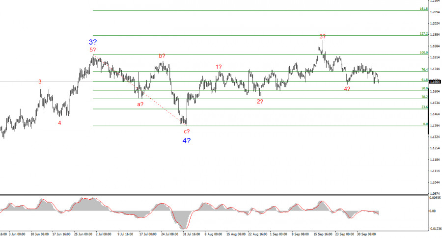 Волновая разметка 4-часового графика для инструмента EUR/USD не меняется уже несколько месяцев, но в последние недели принимает более сложный вид. Пока еще рано делать выводы об отмене повышательного участка тренда, но новое снижение европейской валюты приведет к необходимости внесения коррективов. Построение повышательного участка тренда продолжается, а новостной фон продолжает поддерживать по большей части не доллар. Торговая война, начатая Дональдом Трампом, продолжается. Противостояние с ФРС продолжается. «Голубиные» ожидания рынка по ставке ФРС растут. В Америке начался «шатдаун». Рынок крайне невысоко оценивает результаты первых 7-8 месяцев Дональда Трампа, хоть экономический рост во втором квартале и составил почти 4%. В данное время можно предположить, что продолжается построение импульсной волны 5, цели которой можно разбросать вплоть до 25-й фигуры. Внутри этой волны структура достаточно сложна и неоднозначна, но старший ее масштаб особых вопросов не вызывает. В данное время просматриваются три волны вверх, следовательно, инструмент находится в построении волны 4 в 5, которая принимает трехволновой вид и уже может быть завершена.