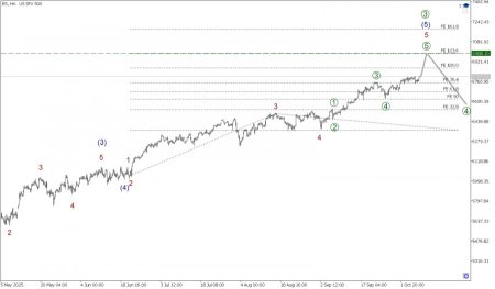 FxSignal Вчера, 21:39 4 Аналитика, прогнозы валютного рынкаВ глобальной перспективе по индексу SP500 может формироваться крупный импульс (1)-(2)-(3)-(4)-(5). Подволна (1) и (2) сформированы. На последнем участке графика представлена восходящая импульсная волна (3), размеченная подволнами 1-2-3-4-5. В составе волны (3) завершенными смотрятся подволны 1-2-3-4. Коррекционная волна 4 не так давно подошла к концу и приняла форму двойного зигзага. На последнем участке цены мы можем наблюдать построение новой и финальной волны 5. Волна 5 может принять форму импульса [1]-[2]-[3]-[4]-[5]. Завершены подволны [1]-[2], и сейчас растем в более мощной подволне [3]. Вероятно, быки нацелены на предыдущий максимум 6864, на указанном уровне величина импульса 5 будет равна 100% по расширению Фибоначчи от волны 3. В текущей ситуации можно рассматривать открытие длинных позиций с целью забрать прибыль на завершении импульсного роста в районе предыдущего максимума. Торговые рекомендации: Buy 6797.39, takeprofit 6988.10.
