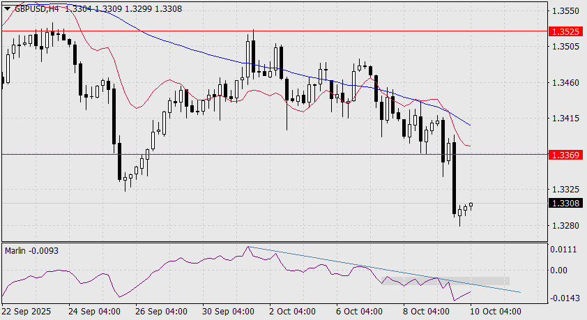 На четырёхчасовом графике цена немного корректирует от вчерашнего минимума. Ситуация по осциллятору Марлин показывает, что коррекция скоро завершится, так как сигнальную линию осциллятора скоро встретят сопротивления образующей линии и диапазон консолидации. Ждём цену у целевого уровня 1.3253.