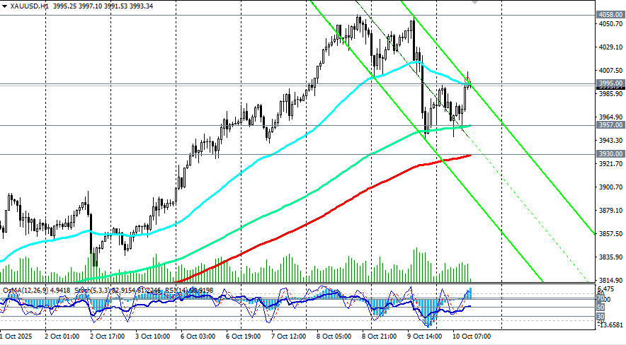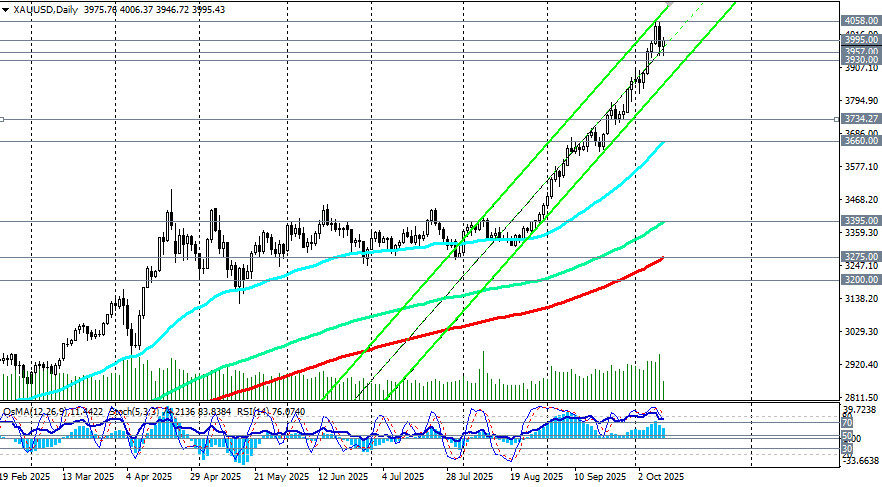В альтернативном сценарии нашего недавнего обзора мы предположили, что если доллар начнет более активно укрепляться, то после пробоя отметки 3982.00 цена может продолжить снижаться к краткосрочному уровню поддержки 3884.00 (на тот момент через эту отметку проходила ЕМА200 на 1-часовом графике). Собственно говоря, в четверг события начали развиваться именно по данному сценарию. Несмотря на то что цена почти смогла обновить недавний рекордный максимум, достигнутый в среду вблизи отметки 4058.00, в начале американской торговой сессии четверга цена стала резко снижаться и, пробив отметки 4000.00, 3982.00 упала к концу американской торговой сессии к отметке 3945.00, соответствующей 3-дневному минимуму. Сегодняшняя азиатская торговая сессия была проведена в диапазоне. Цена колебалась между уровнями поддержки 3957.00 (ЕМА144 на 1-часовом графике) и сопротивления 3995.00 (ЕМА50 и верхняя линия нисходящего канала на 1-часовом графике). На момент публикации данной статьи, XAU/USD также торговалась вблизи отметки 3995.00. В целом преобладает восходящая динамика. Общие перспективы золота остаются положительными, несмотря на временные коррекции. Покупатели воспринимают их как хорошую возможность войти в новые длинные позиции по более выгодным ценам. С этой точки зрения снижение к важному краткосрочному уровню поддержки 3930.00 (ЕМА200 на 1-часовом графике) и локальному уровню поддержки 3900.00 могло бы стать отличной возможностью для наращивания длинных позиций. В этом случае ограничительные стопы могли бы быть установлены ниже отметки 3890.00. Более глубокая коррекция в рамках краткосрочного медвежьего тренда – снижение к «круглой» отметке и краткосрочному уровню поддержки 3734.00 (ЕМА200 на 4-часовом графике) и к отметке 3700.00, от которых можно строить новые ордера на покупку. Лишь пробой ключевых уровней поддержки 3275.00 (ЕМА200 на дневном графике), 3200.00 (ЕМА50 на недельном графике) будет означать слом среднесрочного бычьего тренда, что сделает преимущественными короткие позиции в среднесрочном периоде. Пока же в преимуществе длинные позиции, а текущая коррекция уже может рассматриваться как возможность для покупок. В основном сценарии ждем возобновление роста. Пробой недавнего максимума 4058.00 откроет цене путь к новым рекордам. В целом общий тренд XAU/USD остается восходящим, и логичнее искать возможности для новых покупок.*) см. также наш недавний обзор и фундаментальный анализ «XAU/USD: доллар vs. золото»