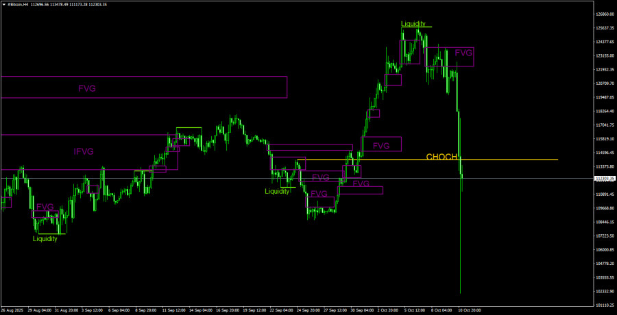 На 4-часовом таймфрейме цена резко обрушилась вниз после снятия ликвидности на продажу, сформировался «медвежий» FVG, который был отработан трижды. Как видим, предупреждений о грядущем падении было огромное количество. Напомним, что на дневном ТФ перед падением был сформирован еще один «медвежий» OB и вновь была снята ликвидность на продажу. Поэтому возможностей открывать короткие позиции у трейдеров было в избытке. В ближайшее время наверняка будет сформирована целая серия «медвежьих» FVG, но теперь нужно дождаться, чтобы рынок немного успокоился.Рекомендации по торговле BTC/USD: