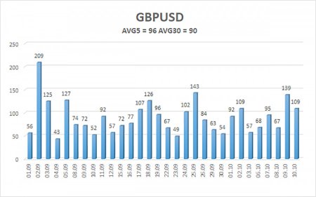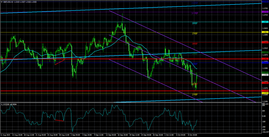 Валютная пара GBP/USD в течение пятницы также показала восходящее движение, которое было спровоцировано Дональдом Трампом, о торговое войне которого многие начали забывать в последнее время. Однако Трамп на этой неделе не получил, как мечтал, Нобелевскую премию мира, поэтому решил, вероятно, отыграться на Китае, введя с ноября-месяца новые тарифы в размере 100% на все товары. Формально причиной является ограничение Китаем экспорта редкоземельных металлов, по добыче которых Поднебесная является лидером в мире. Следовательно, в некотором роде монополистом. Трампу не понравилось, что Пекин теперь будет диктовать свои условия в этой отрасли, и недолго думая обложил дополнительными пошлинами весь импорт из этой страны в США. Как мы и предупреждали, торговая война лишь в самом начале своего пути, а доллару будет крайне сложно рассчитывать на рост при таком фундаментальном фоне. В прошлой статье по EUR/USD мы поговорили о всех факторах первой недели октября, которые ну никак не указывали на рост американской валюты. На этой неделе их было еще меньше. Нужно отметить, что французский политический кризис никакого отношения к британскому фунту не имеет. Протокол ФРС – это достаточно формальный документ, который к тому же публикуется с опозданием на три недели. Рынок его, как правило, игнорирует. Остается только выступление Пауэлла... Но и здесь реагировать было, по сути, не на что. Глава ФРФ в очередной раз озвучил тезисы, которые все трейдеры могли уже выучить наизусть. Монетарная политика будет меняться в зависимости только от макроэкономических данных. Если рынок труда и экономика не потребуют дополнительного стимулирования, ставка не будет снижаться из-за высоких рисков роста инфляции. Таким образом, участники рынка могут мечтать хоть о восьми снижениях ставки на двух последних заседания ФедРезерва(как они это делали в прошлом году), от этого позиция ФРС не изменится. Дональд Трамп, кстати, потерпел поражение в борьбе с ФРС. Мы не сомневаемся в том, что борьба еще не завершена, и Трамп будет склонять чашу весов на свою сторону с течением времени. Но в 2025 году он потерпел поражение, не сумев заставить регулятор понизить ставки так, как нужно ему. Таким образом, об агрессивном смягчении речи не идет, но даже если ФРС ни разу в 2025 году больше ставки не снизит, что это меняет для доллара? Разве доллар падал из-за того, что ФРС смягчала монетарную политику? Как раз наоборот – ЕЦБ и Банк Англии смягчали монетарную политику, а ФРС лишь в сентябре один раз понизила ключевую ставку. Сейчас ЕЦБ и БА берут паузу, а ФРС в самом благоприятном для доллара случае тоже возьмет паузу. В худшем – продолжит снижение ключевой ставки из-за слабости рынка труда. Поэтому фактор монетарной политики никакой поддержки доллару даже теоретически оказать не может. А вот новый виток торговой войны – создаст. Средняя волатильность пары GBP/USD за последние 5 торговых дней составляет 96 пунктов. Для пары фунт/доллар это значение является «средним». В понедельник, 13 октября, таким образом, мы ожидаем движения внутри диапазона, ограниченного уровнями 1,3259 и 1,3451. Старший канал линейной регрессии направлен вверх, что указывает на однозначную восходящую тенденцию. Индикатор CCI еще раз(в третий раз) зашел в область перепроданности, что снова предупреждает о возможном возобновлении вос