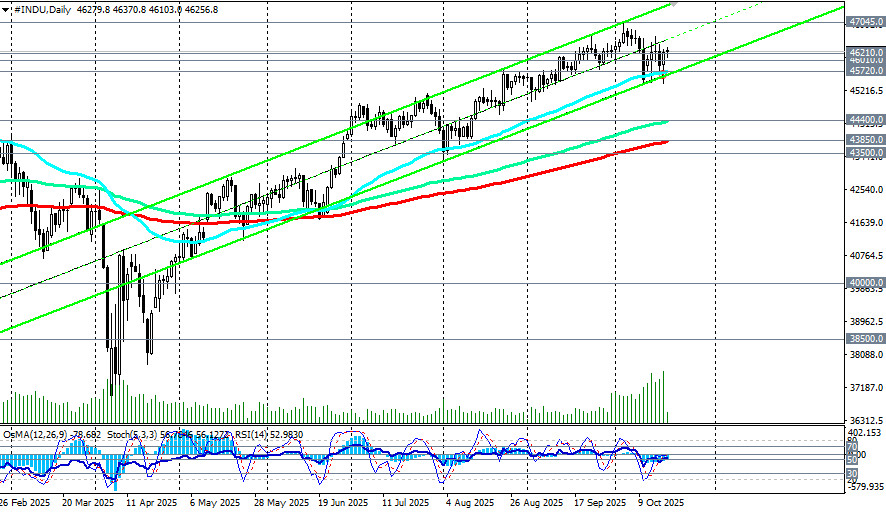 В то время, как индекс доллара USDX остается под давлением, фьючерсы на основные американские фондовые индексы показывают умеренный рост в начале недели. Инвесторы реагируют на сочетание ожиданий более мягкой политики ФРС и возможного улучшения торговых условий и торговых отношений между США и Китаем, отметили мы в нашем сегодняшнем фундаментальном анализе и обзоре «DJIA: на фоне смягчения торговой напряженности и ожиданий снижения ставок ФРС». Так, фьючерсы на американский промышленный индекс Dow Jones (сокращенно DJIA или INDU в торговом терминале) пытаются сегодня продолжить рост, начавшийся в период американской торговой сессии пятницы. В начале сегодняшней европейской торговой сессии фьючерсы DJIA приближались к отметке 46370.0, а на момент публикации данной статьи торговались вблизи отметки 46300.0, пытаясь более надежно закрепиться в зоне краткосрочного бычьего рынка – выше важного краткосрочного уровня поддержки 46210.0 (ЕМА200 на 1-часовом графике). Если напряженность на рынках продолжит спадать, то следует ждать возобновление глобальной восходящей динамики американского фондового рынка и его основных индексов, в частности индекса Dow Jones Industrial Average, также предположили мы в нашем недавнем обзоре DJIA: новые тарифные угрозы Трампа наносят удар по рынку. Несмотря на недавнее снижение, цена на фьючерсы Dow Jones Industrial Average остается в зоне бычьего рынка, среднесрочного - выше ключевых уровней поддержки 44400.0, 43850.0 (200-периодная скользящая средняя на дневном графике), долгосрочного – выше 40000.0, 38500.0 (200-периодная скользящая средняя на недельном графике). В случае возобновления роста первым сигналом для новых покупок может стать пробой сегодняшнего максимума 46370.0 и максимума четверга 46466.0, а ближайшей целью – недавний и рекордный максимум, достигнутый в начале месяца вблизи отметки 47045.0. В альтернативном сценарии и после пробоя уровня поддержки 46210.0 и сегодняшнего минимума 46103.0, снижение цены продолжится в сторону нижней границы восходящего канала на дневном графике и отметки 45720.0 (это также ЕМА50 на дневном графике). Более глубокая коррекция подразумевает снижение цены к зоне ключевых среднесрочных поддержек и уровней 44400.0 (ЕМА144 на дневном графике), 43850.0 (ЕМА200 на дневном графике), удерживающих индекс DJIA в зоне среднесрочного бычьего рынка. В основном сценарии ожидаем все же возобновление роста и обновление рекордных максимумов выше отметки 47045.00, если только Трамп или неожиданная резкая эскалация геополитической напряжённости в каком-нибудь из регионов мира вновь «не спутают все карты». Уровни поддержки: 46210.0, 46010.0, 45720.0, 44400.0, 43850.0, 43500.0 Уровни сопротивления: 46370.0, 46466.0, 46676.0, 47000.0, 47045.0, 48000.0 Торговые сценарии
